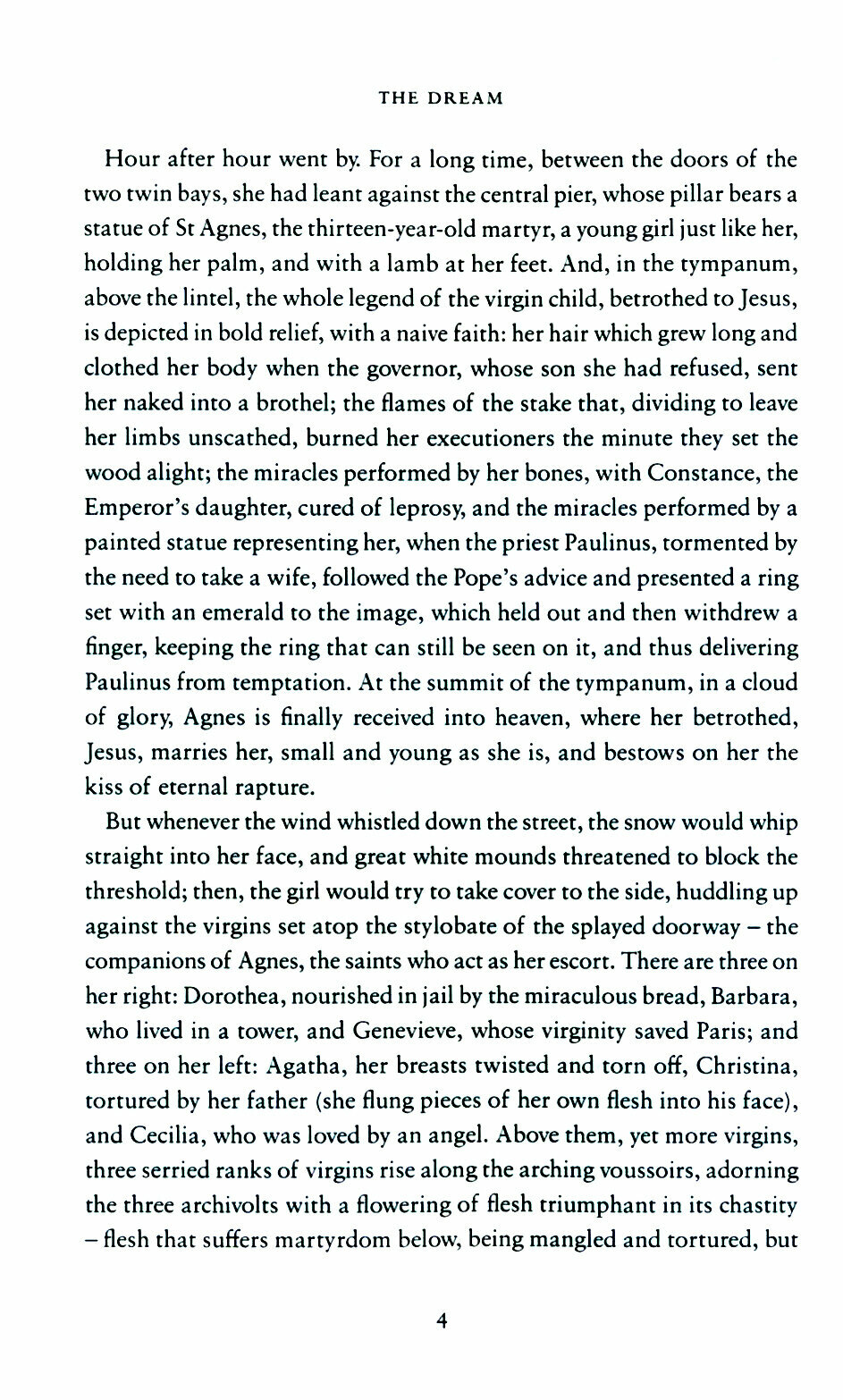 Finding the young Angelique on their doorstep one Christmas Eve, the pious Hubert couple decide to bring her up as their own. As the girl grows up in the vicinity of the town’s towering cathedral and learns her parents’ trade of embroidery, she becomes increasingly fascinated by the lives of the saints, a passion fuelled by her reading of the Golden Legend and other mystical Christian writings. One day love, in the shape of Felicien Hautecoeur, enters the dream world she has constructed around herself, bringing about upheaval and distress.