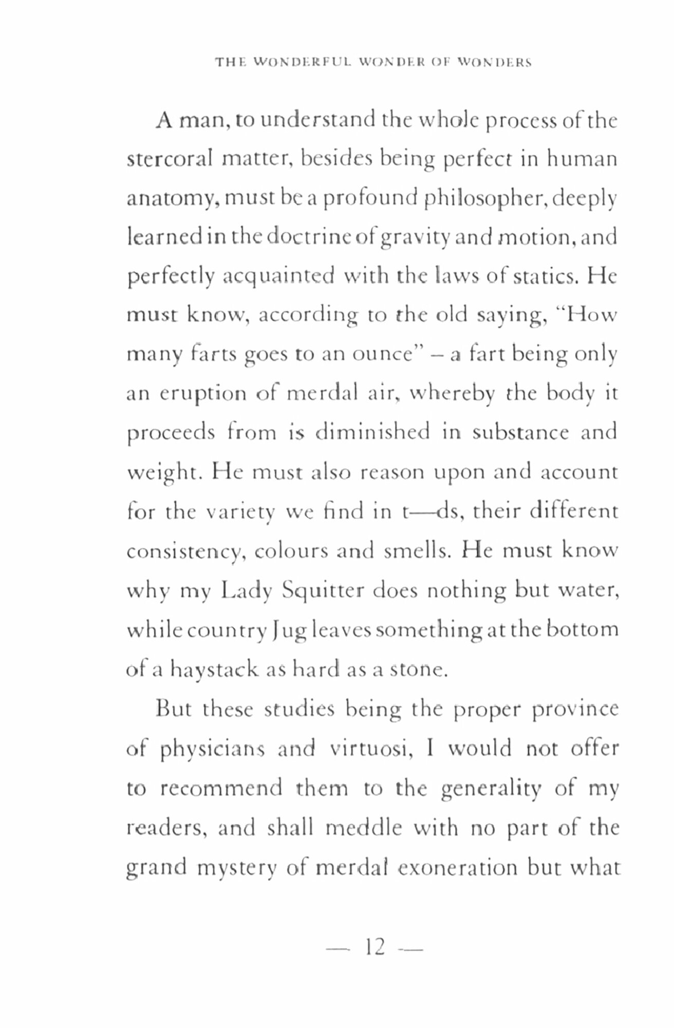 A glorious exercise in cheeky punmanship, The Wonderful Wonder of Wonders sees Jonathan Swift in fine scatological form. Flying by the seat of his pants, the great author treats us to a condensed biography of his posterior, enlivened by some inspired wordplay.