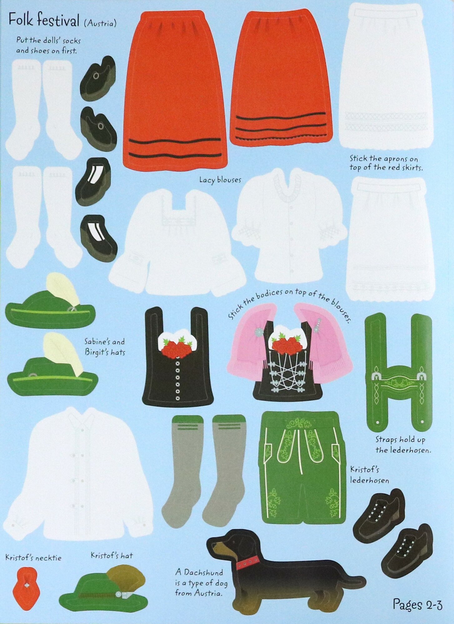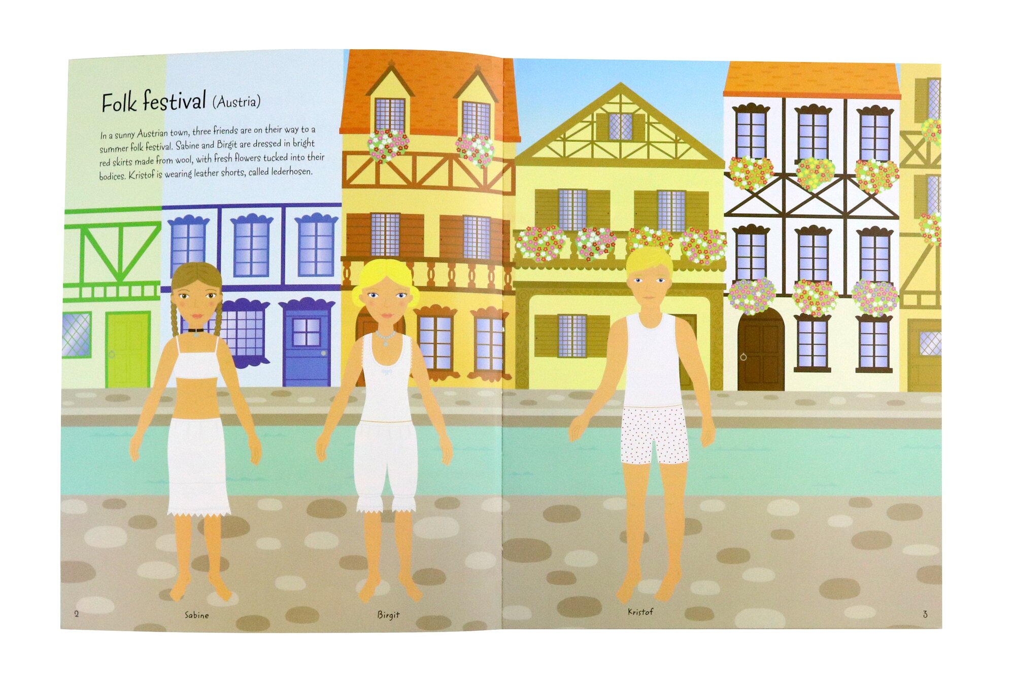 Dress the girl and boy dolls in wonderful traditional costumes for festivals and ceremonies around the world, including beautiful silk saris at an Indian wedding, fabulous flamenco dresses in Spain, a Mexican carnival and harvest festival in Tibet. There’s over 250 stickers of outfits and accessories, and a sticker world map of all the countries.
