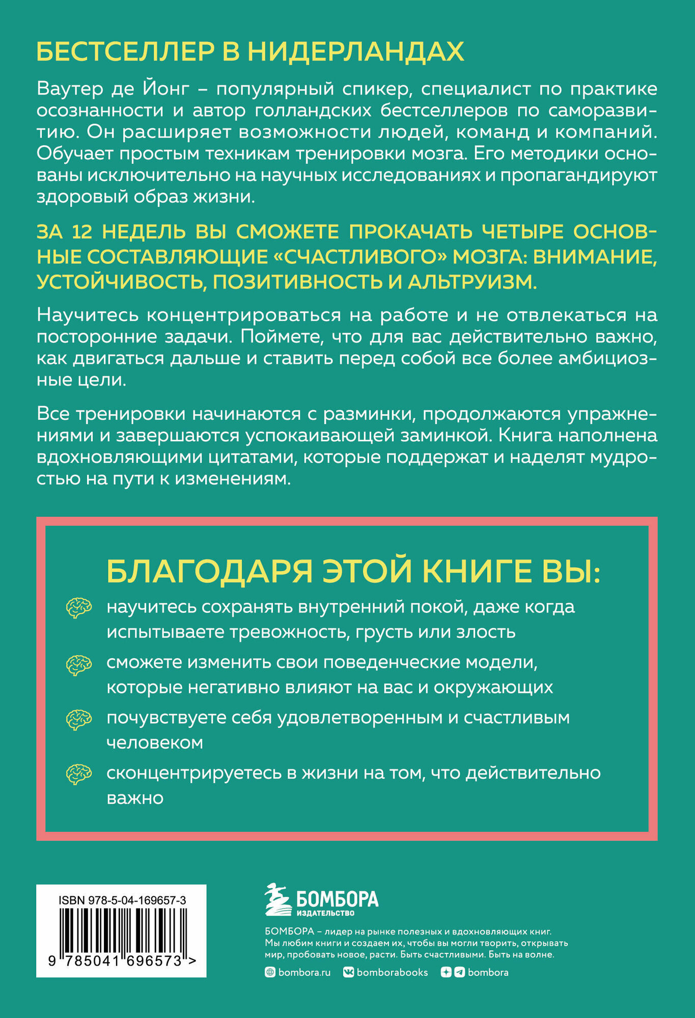 Ваутер де Йонг — популярный спикер, специалист по майндфулнесс и автор голландских бестселлеров по саморазвитию. Он расширяет возможности людей, команд и компаний. Обучает простым техникам тренировки мозга. Его методики основаны исключительно на научных исследованиях и пропагандируют здоровый образ жизни и альтруизм.