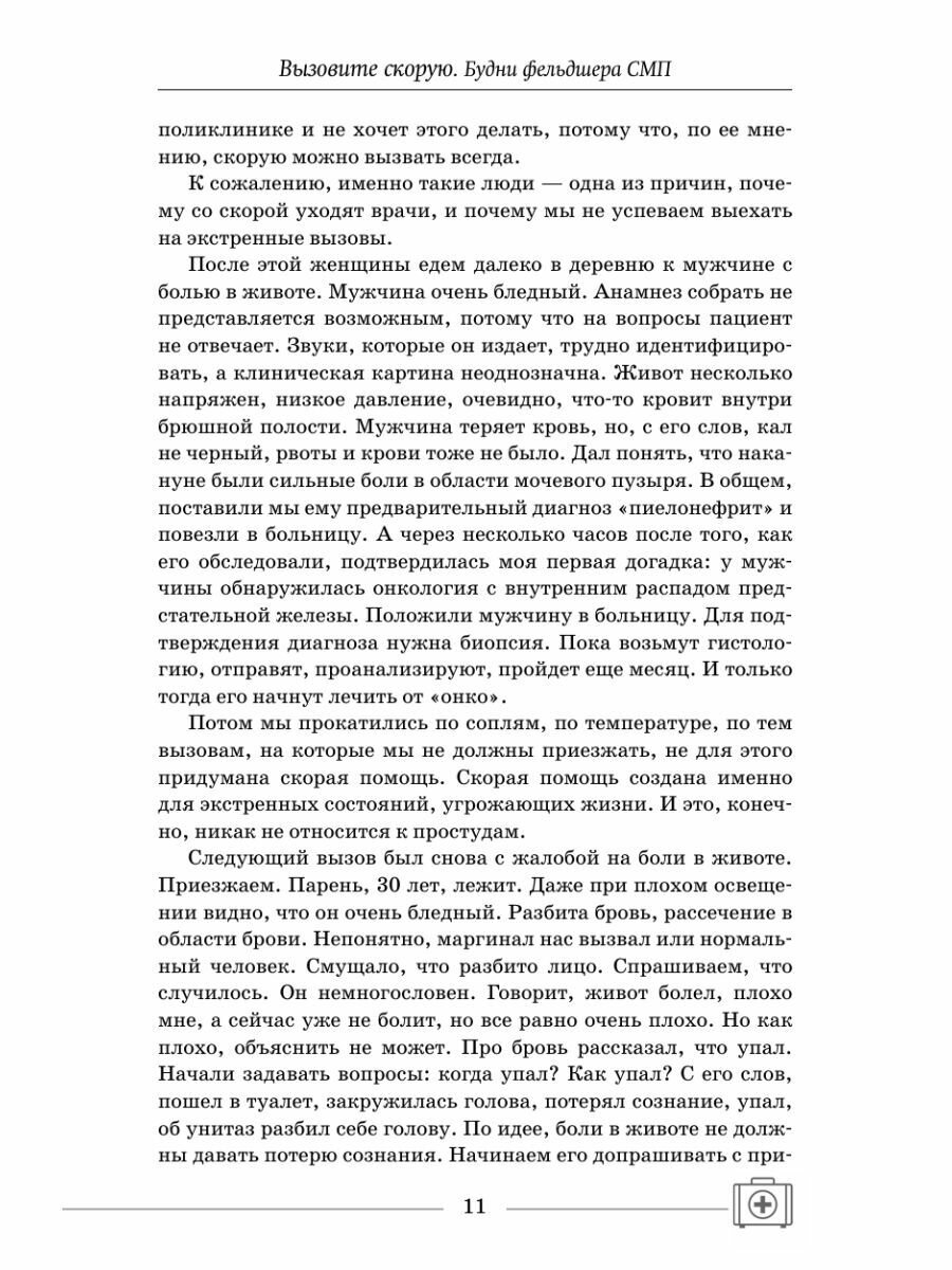 «Вызовите скорую. Будни фельдшера СМП» – это сборник рассказов не только о медицинских буднях, но и о человеческой силе, стойкости и сочувствии. В этой книге вы узнаете, как бригада скорой медицинской помощи оказалась в цыганском таборе или что случилось с мужчиной у ларька с шаурмой, как бабушкины протезы в стакане отбили тягу к алкоголю у внука или что стало с висельником, который решил свести счеты с жизнью.