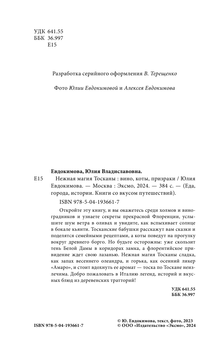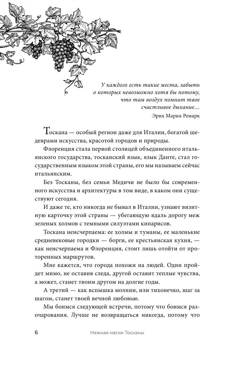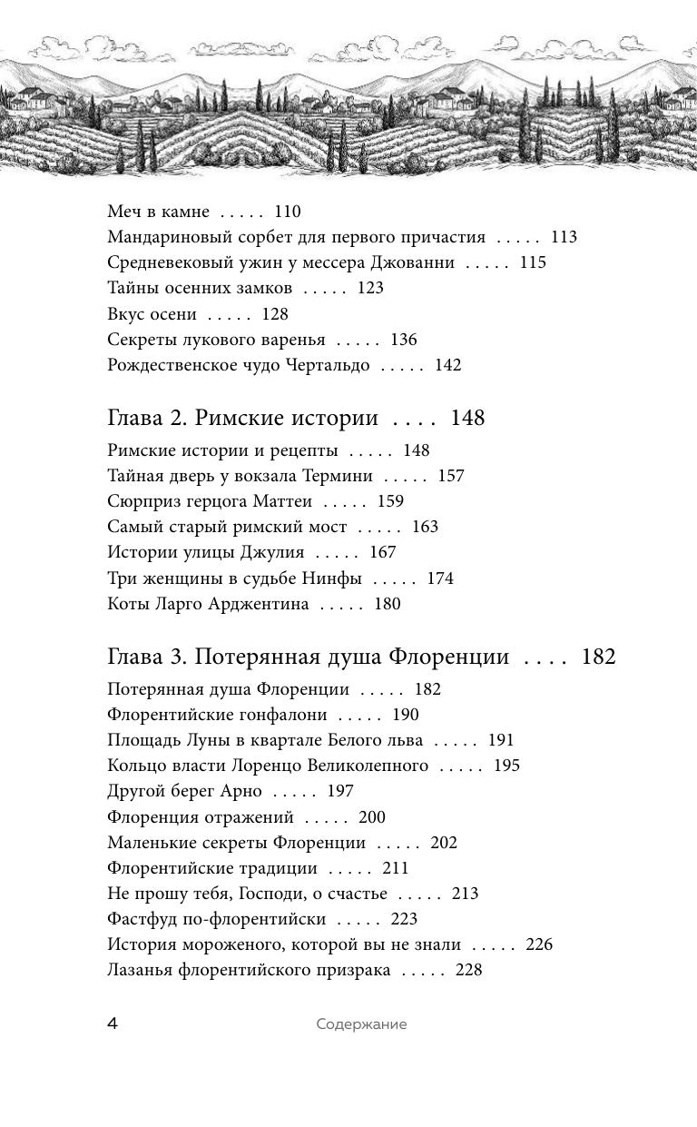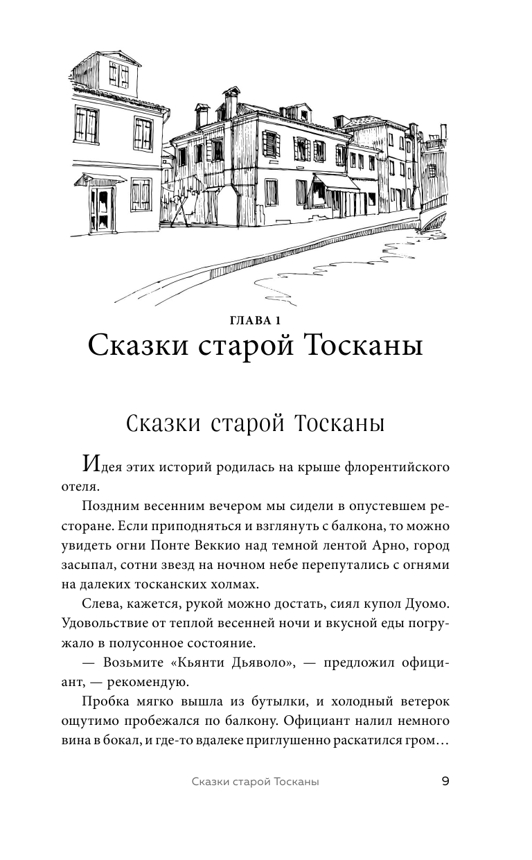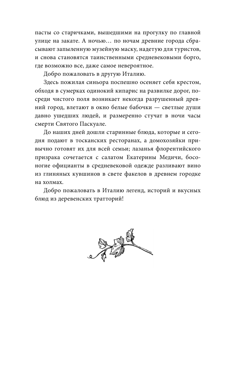 В ожидании новых путешествий откройте книгу и шагните со страниц на дорогу, петляющую среди холмов, с темными силуэтами кипарисов и башнями средневековых городков на горизонте. Окунитесь в зелень виноградников, распахните ставни в старом дворце, пока туман уплывает за далекие холмы. Испеките лазанью флорентийского призрака. Почувствуйте нежную магию Тосканы!