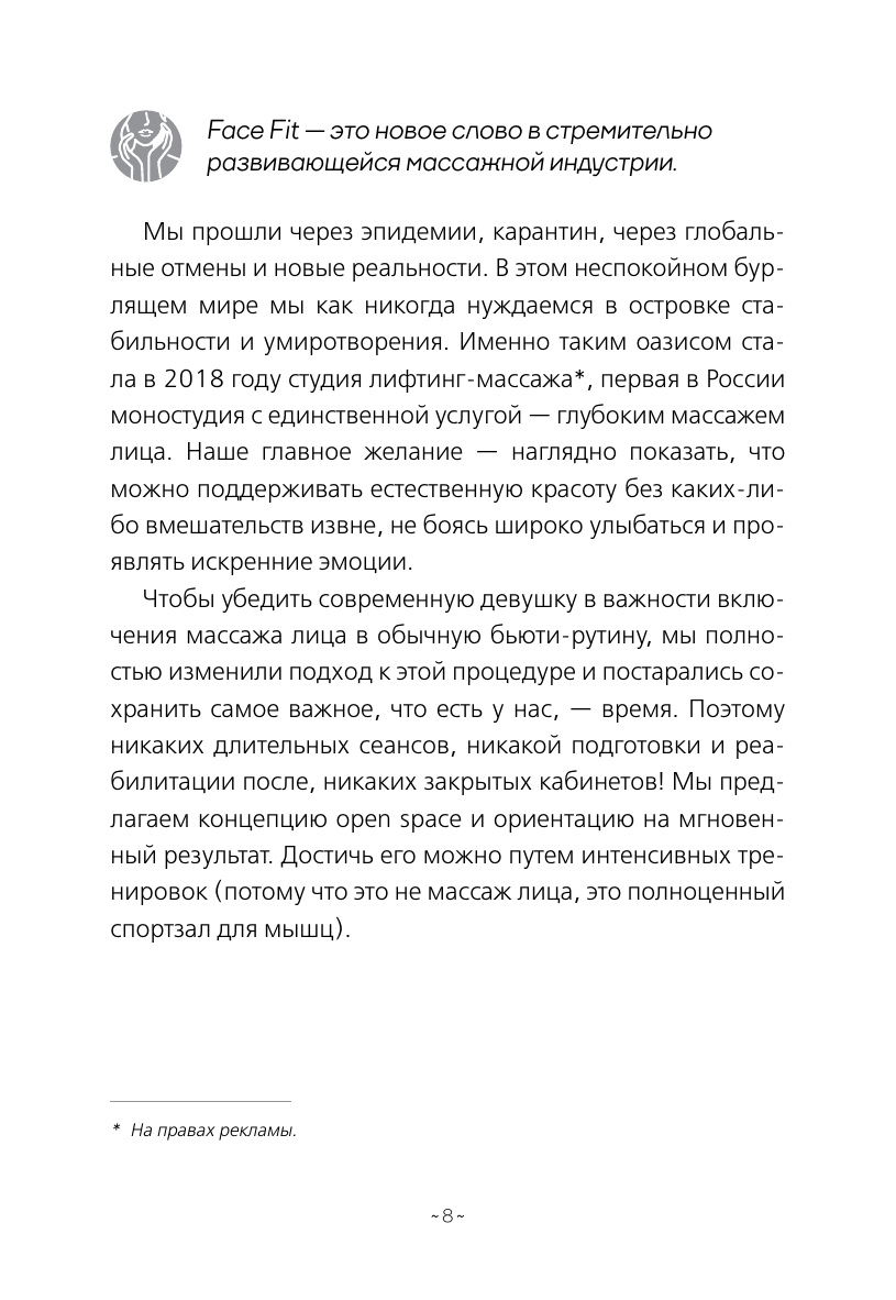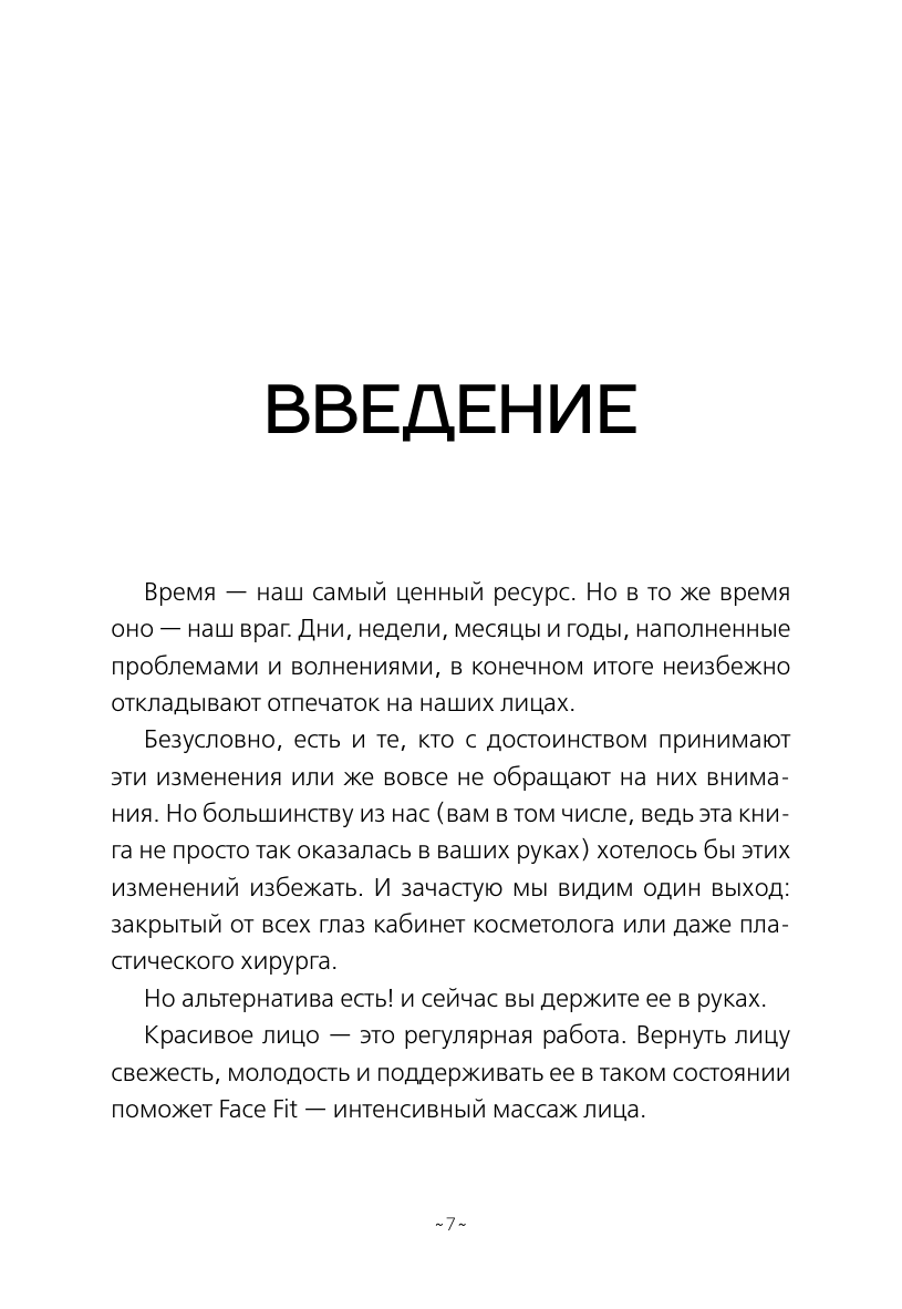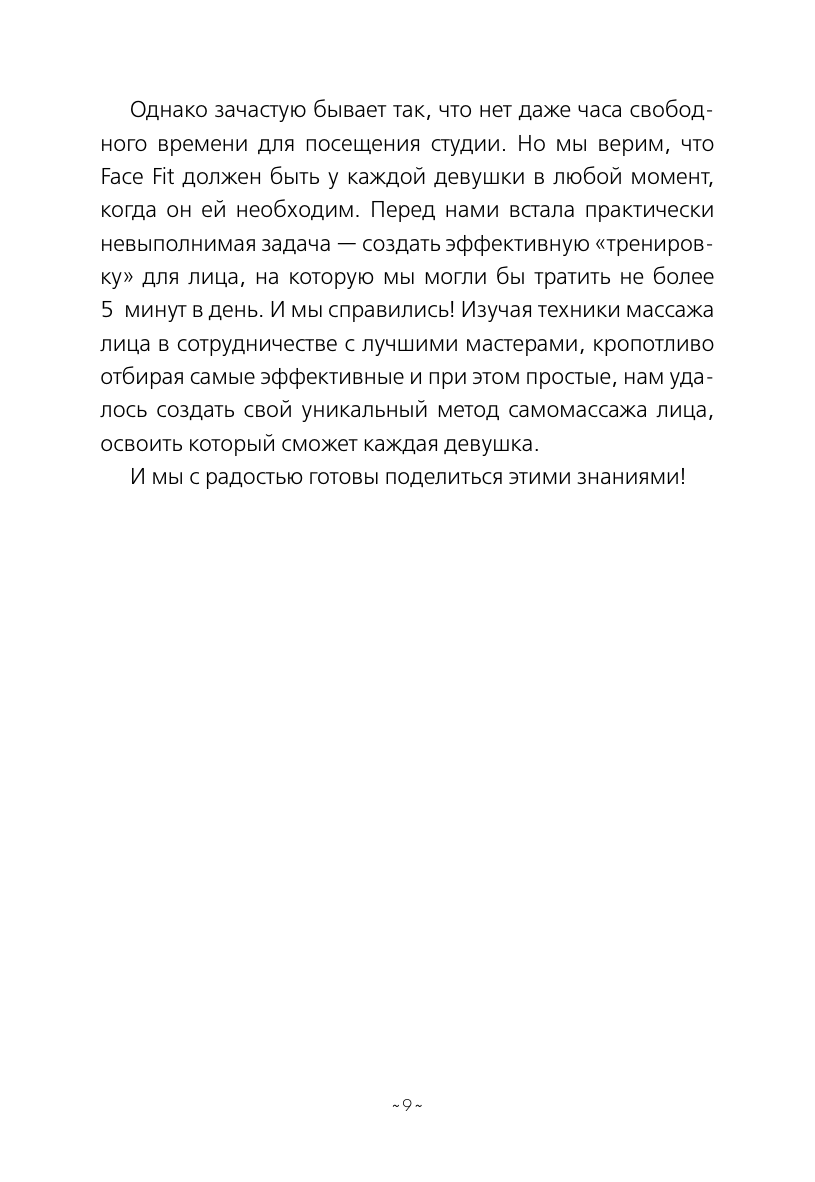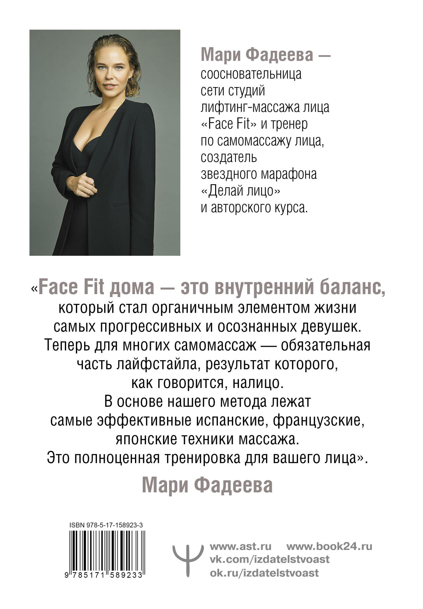 Имя Мари Фадеевой ассоциируется с революцией в сфере красоты и ухода за собой. Эксперт и тренер по самомассажу, блогер, рекомендациям которого следуют более 130 тысяч человек, Мари Фадеева предлагает представительницам прекрасного пола свою авторскую методику по самомассажу Face Fit, которая позволит женщинам сохранить молодость и привлекательность на долгие годы. Методика создана на основе лучших современных техник самомассажа. Книга содержит не только детальное описание техник и пошаговые алгоритмы их выполнения, но и множество полезных советов по уходу за собой, подбору и употреблению витаминов, выбору гаджетов для красоты и здоровья кожи лица и т. д. Упражнения проиллюстрированы цветными фотографиями.