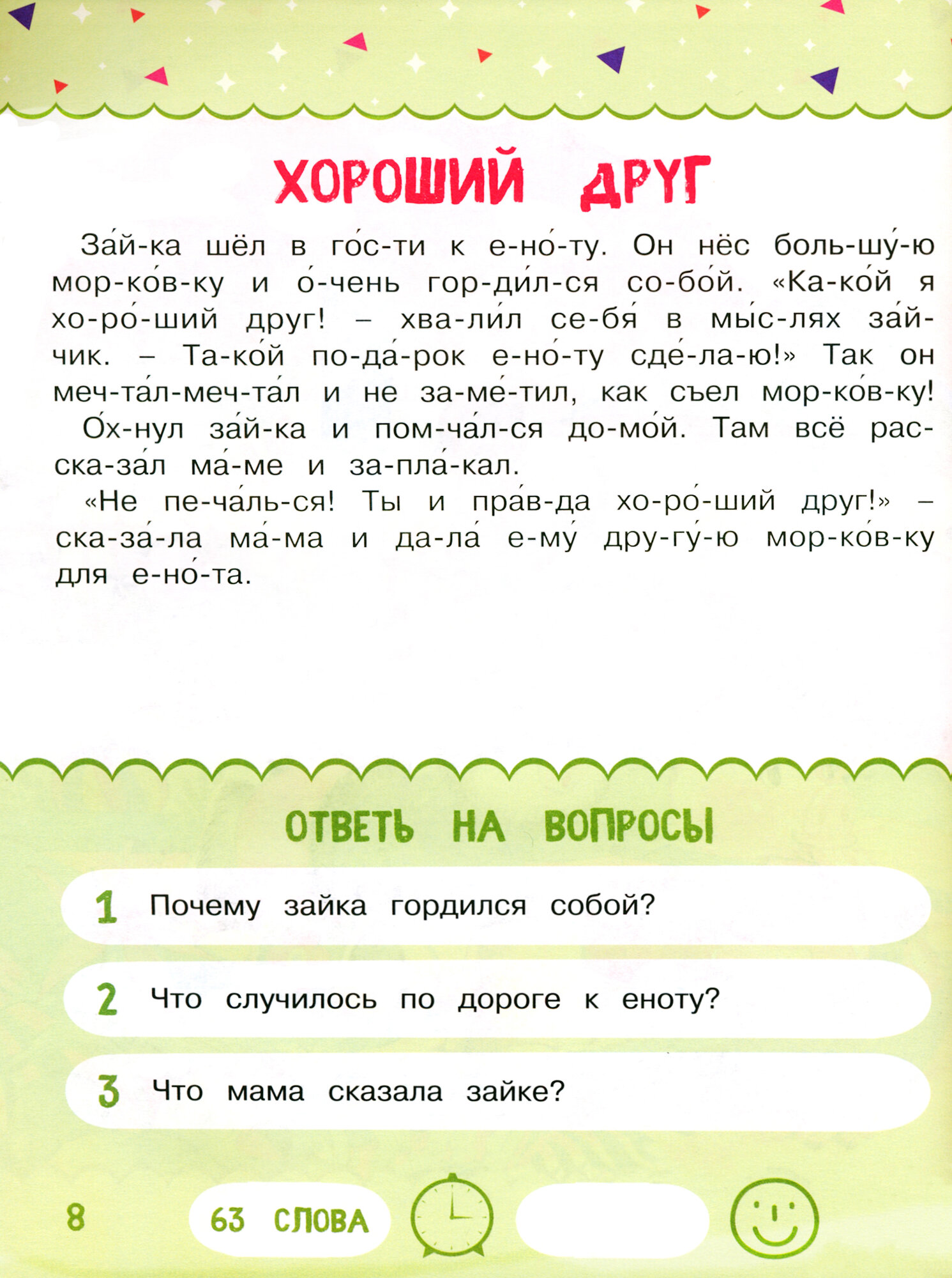 Рекомендуется совместная работа взрослых и детей. Во время чтения ребенком вслух взрослый должен контролировать правильность ударений и интонации. Можно засечь время, которое ребенку понадобится для прочтения стихотворения, и записать его внизу страницы. Результат может быть улучшен при втором прочтении. Вопросы по содержанию стихотворения взрослый задаст ребенку, а потом они вместе обсудят прочитанную историю и сделают из нее правильные выводы.