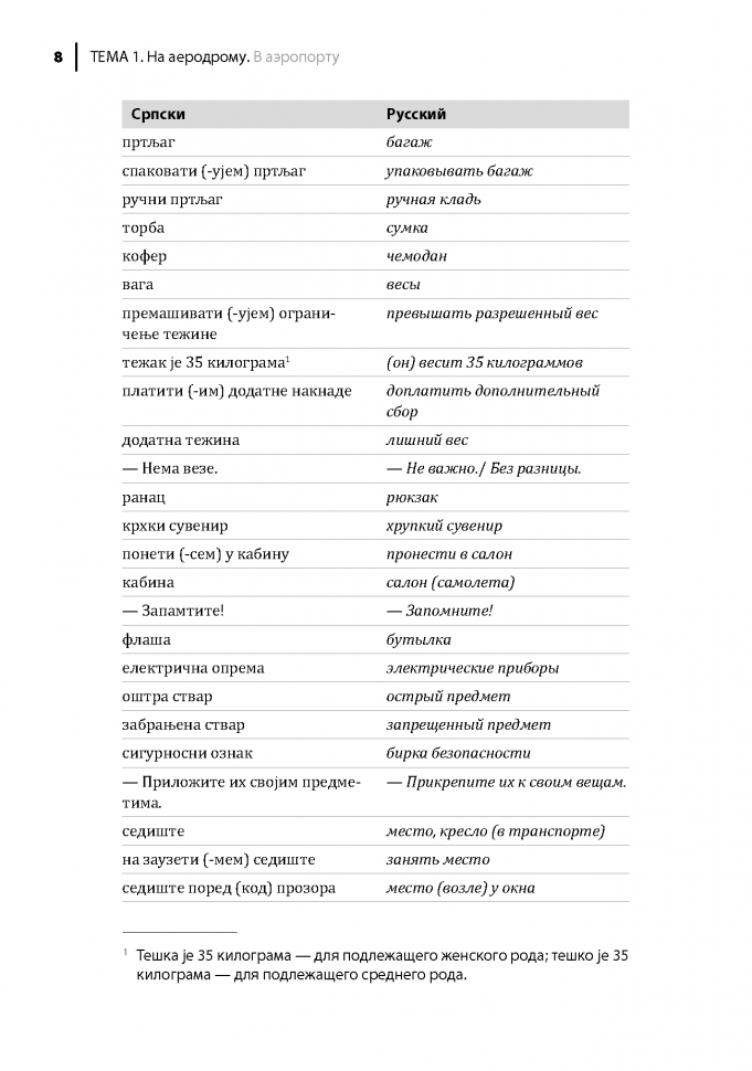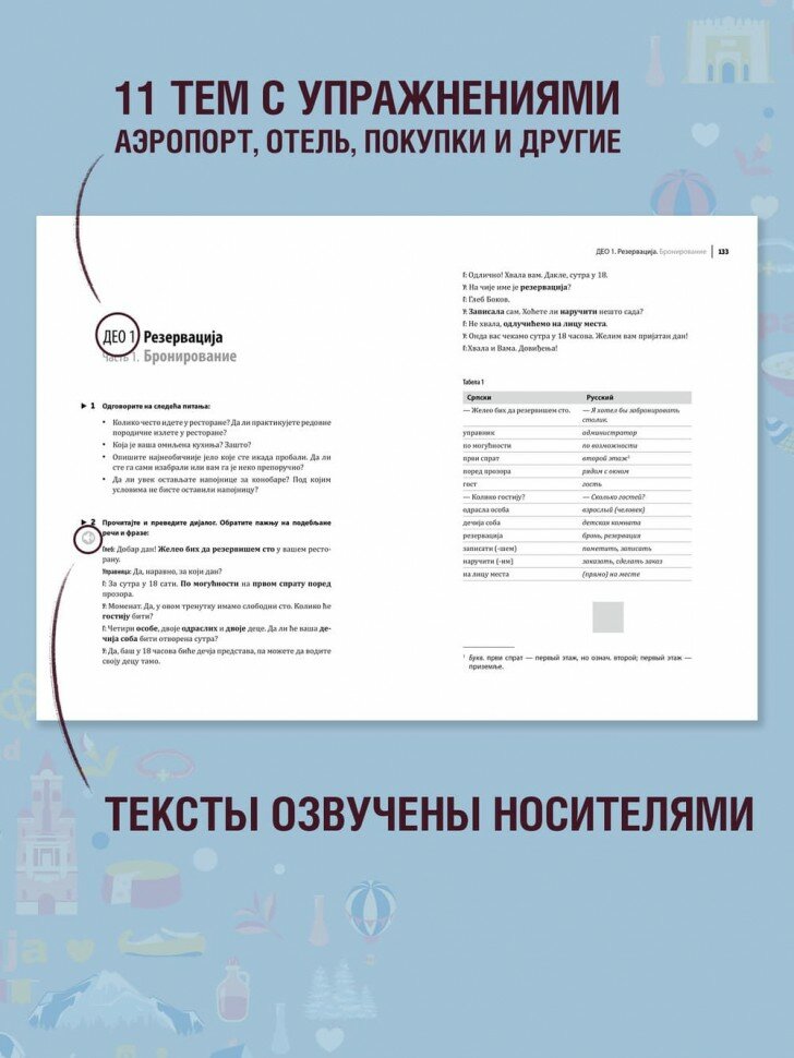 Темы пособия отражают современные реалии повседневной жизни Сербии. С помощью упражнений и словаря в каждом уроке вы значительно расширите свою лексическую базу и научитесь использовать новые слова и выражения в реальных условиях. Как свободно говорить со служащими аэропорта, отеля или ресторана, как воспользоваться услугами автосервиса, чувствовать себя уверенно в магазине, проходить собеседование при приеме на работу — этому и многому другому вы научитесь с помощью данной книги.