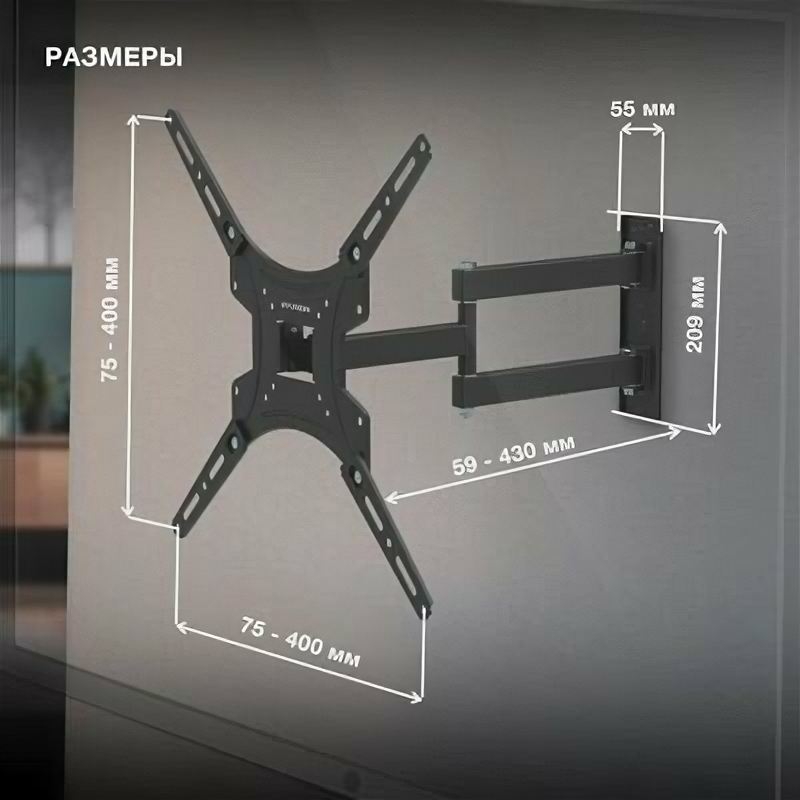 Конструкция кронштейна обеспечивает возможность размещения телевизора на расстоянии 59–430 мм от стены. Это позволяет повесить его в углу помещения, а при размещении на прямом участке – сэкономить свободное пространство в комнате.