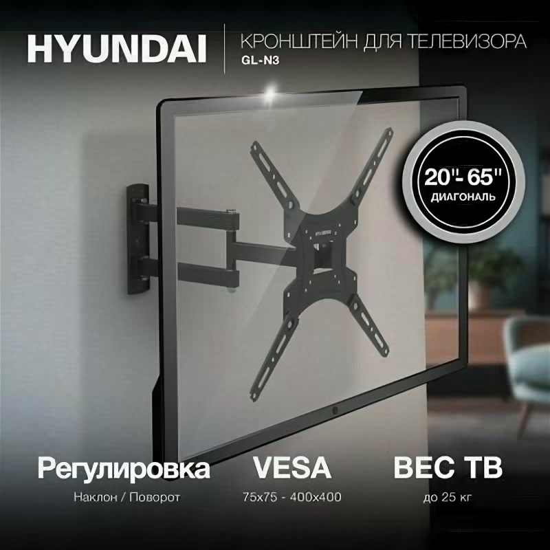 Кронштейн для телевизора Hyundai черный 20"-65" макс.25кг настенный поворотно-выдвижной и наклонный