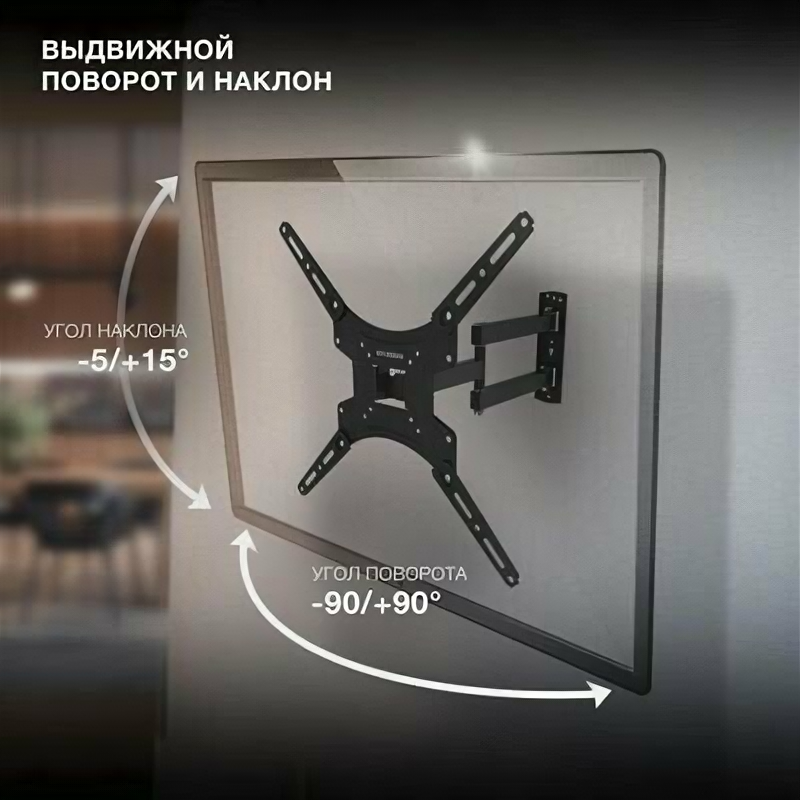 Наличие в кронштейне двух независимых шарниров обеспечивает возможность поворота телевизора влево и вправо на 90 градусов. В сочетании с наклоном по вертикали на -5/+15 градусов это гарантирует отличный обзор экрана из любой точки комнаты при размещении на удобной высоте.