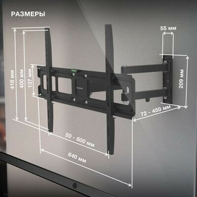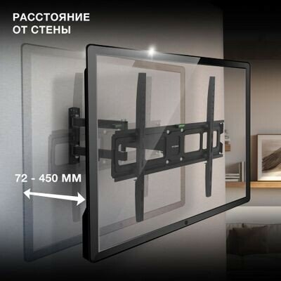 Ещё одно достоинство конструкции — двухрычажный выносной механизм. Он позволяет изменять расстояние от стены до телевизора в диапазоне от 72 до 450 мм, а также поворачивать его на 90 градусов влево или вправо. В сочетании с возможностью наклона на 5 градусов вверх или на 12 градусов вниз это раскрывает широкие возможности для выбора места размещения монитора и регулирования положения экрана для наиболее комфортного обзора из любой точки комнаты.