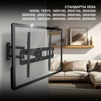 Поворотно-наклонный кронштейн идеально подходит для подвешивания на стене больших ЖК-телевизоров с диагональю экрана от 32 до 75. Благодаря прочному металлическому каркасу и надежной рамочной конструкции он способен гарантированно выдержать нагрузку до 40 кг.