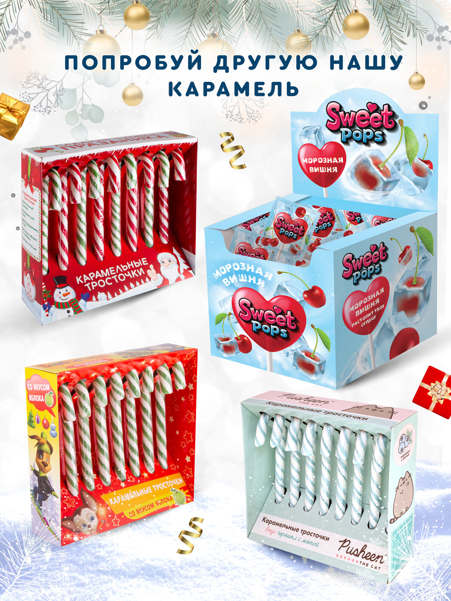 Леденцы упакованы в подарочные коробочки с новогодним дизайном. На упаковках изображены Маша с подарками, Медведь в шапочке Деда Мороза, снежинки, ёлки и самые зимние птицы - снегири. В каждой упаковке - 8 карамельных тростей со вкусом малины. Их можно есть как самостоятельное лакомство или добавлять в чай. Трости отлично подойдут для оригинального оформления интерьера на вечеринках или в качестве украшения праздничного стола и подарков.