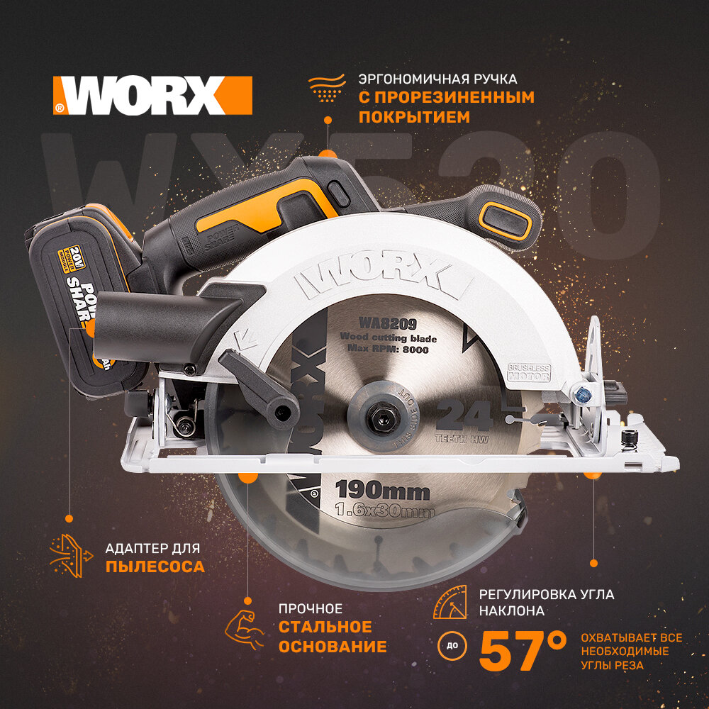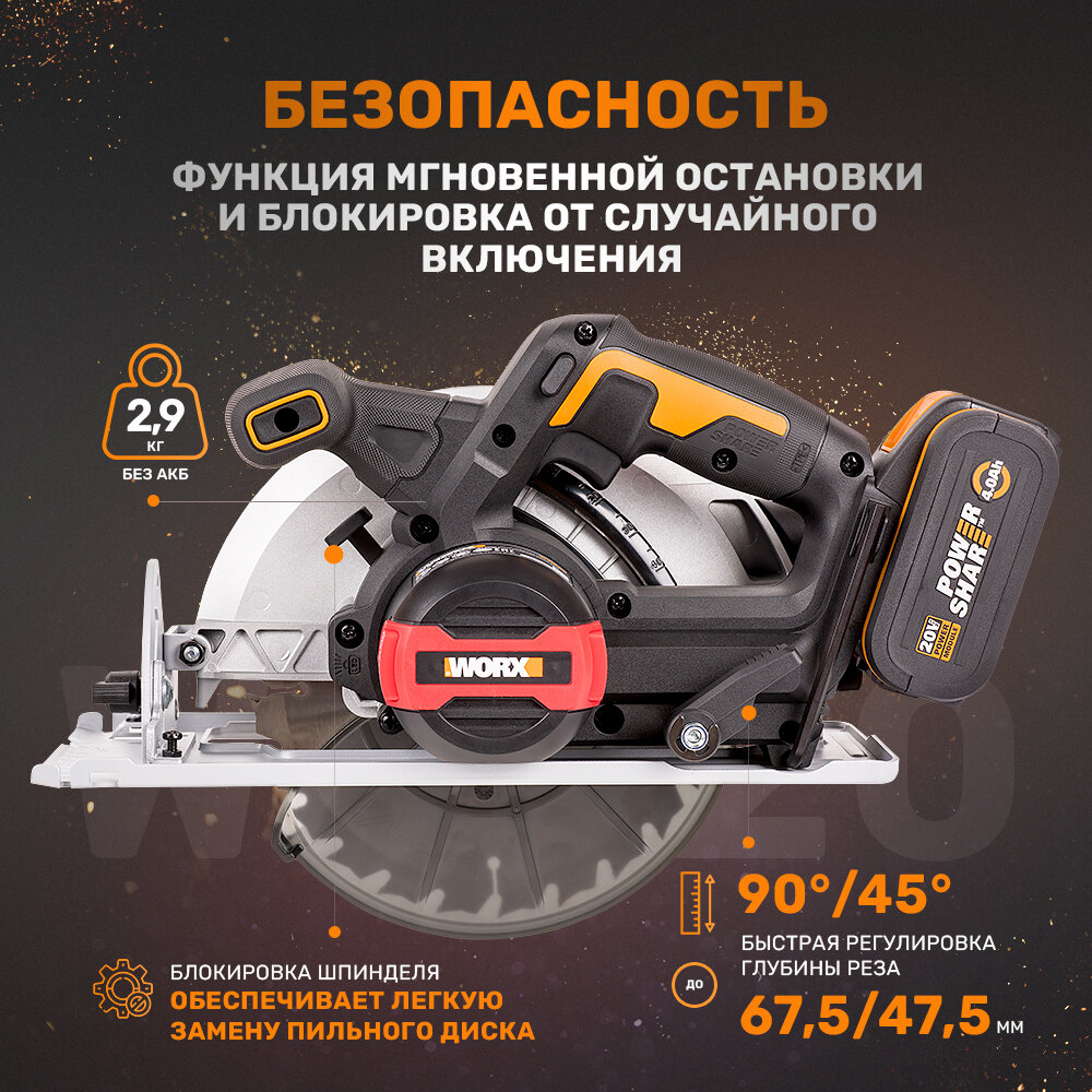 Циркулярная пила WORX 20V 190мм аккумуляторная бесщеточная 4Ач х1 ЗУ 2А WX520
