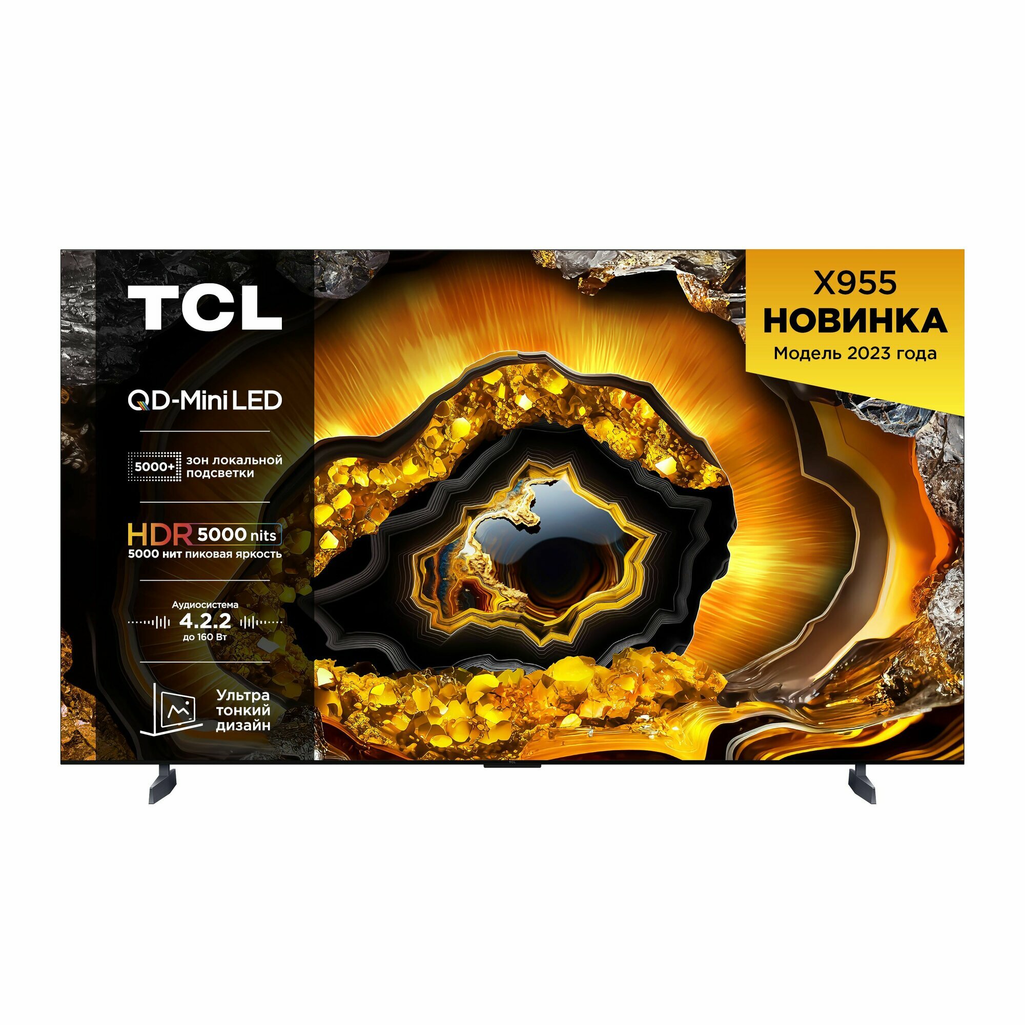 Исключительный шедевр TCL QD-Mini LED - это шедевр с точки зрения качества изображения, который передает визуальные эффекты с максимально реалистичными цветами и сверхвысоким коэффициентом контрастности . Он также отличается более высокой пиковой яркостью, обладает широкой цветовой палитрой, увеличенным размером экрана и более длительным сроком службы. Все это делает его передовой технологией в отрасли дисплеев. Яркость 5000 нит Благодаря пиковой яркости до 5000 нит, используемой в телевизоре TCL X955, вы можете наслаждаться поистине реалистичной картинкой. Переливающаяся поверхность озера, яркий солнечный свет или даже блеск звездного неба могут стать еще более реальными с максимальным эффектом присутствия. Шестикристальный светоизлучающий чип Благодаря революционной технологии, шестикристальный светоизлучающий чип значительно увеличивает яркость и улучшает характеристики экрана, обеспечивая исключительную яркость и уровень затемнения. Больше никаких бликов! Отвлекаетесь на отражения во время просмотра телевизора в ярко освещенной комнате? Мы придумали для вас лучший способсправиться со светом! Ультранизкий коэффициент отражения TCL обеспечивает лучшее поглощение и рассеивание света.Удовольствие от просмотра телевизора гарантировано.Процессор обработки качества изображения с искусственным интеллектом способен воспринять информацию и мыслить как живой разум,фиксируя все детали реального мира в собственной базе данных и выполняя моделирование и оптимизацию на основе анализа человеческоговосприятия. В результате вы получаете яркие цвета, превосходную контрастность и кристальную четкость, как в настоящем мире. Идеальный баланс света и теней Процессор TCL AiPQ распознает многочисленные объекты на экране и использует ai-контраст для обеспечения пиковой яркости 5000 нит и коэффициента контрастности до 50000:1 в процессе оптимизации изображения. В результате вы получаете приятные впечатления от просмотра благодаря 5184 зонам локального затемнения без слепящей яркости и с плавной градацией уровней затемнения. Перейдите на новый уровень качества звука TCL X955 революционным образом изменит ваши впечатления от звука, воспроизведя реальные стереофонические звуки, которые заполнят каждый уголок вашей комнаты. Исключительная 4.2.2-канальная Hi-Fi-система ONKYO мощностью 160 Вт погружает вас в звук благодаря 4 основным выходам: 2 низкочастотным динамикам с глубоким басовым звуком и 2 каналами для направленного в потолок звука, обеспечивая максимальную громкость 160 Вт. Приходите и испытайте реальное наслаждение от разнообразных развлечений, включая интересные фильмы, музыкальные фестивали и увлекательные компьютерные игры. Ультратонкий дизайн Модель X955 можно легко вплотную закрепить на стене благодаря ультратонкому цельному корпусу.X955 идеально впишется в ваш интерьер, украшая дом, словно произведение искусства.