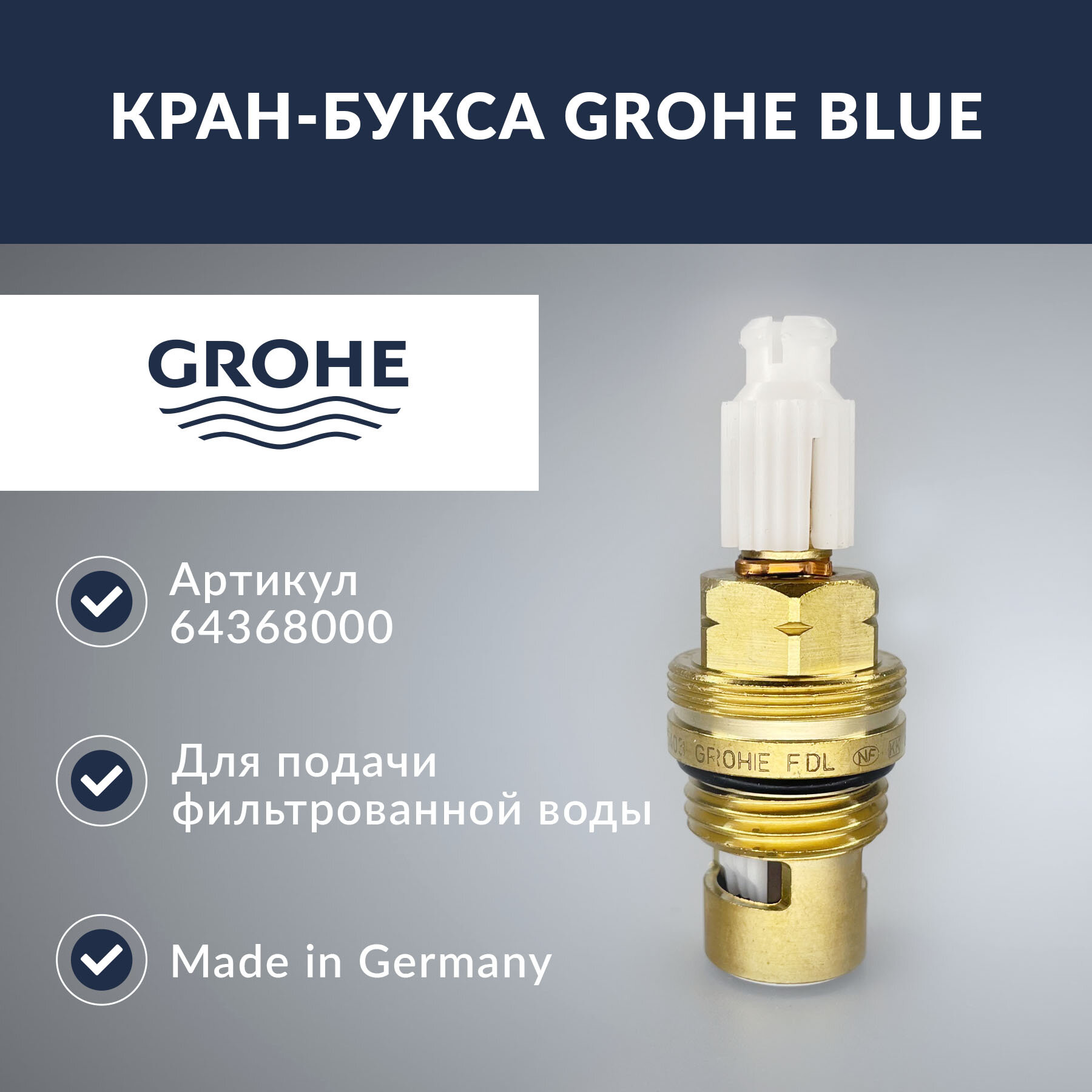 Керамическая кран-букса 1/2 Grohe Blue () - это высококачественный компонент для смесителей, который обеспечивает плавную и точную регулировку подачи воды.Кран-букса изготовлена из латуни и керамики, что гарантирует ее долговечность и надежность в использовании. Благодаря этому компоненту, подача фильтрованной воды в смесителе для кухни GROHE Blue® Pure артикул 31299001 становится более удобной и точной.Подходит к смесителям Grohe Blue: 31299001, 33251000 и т. д.