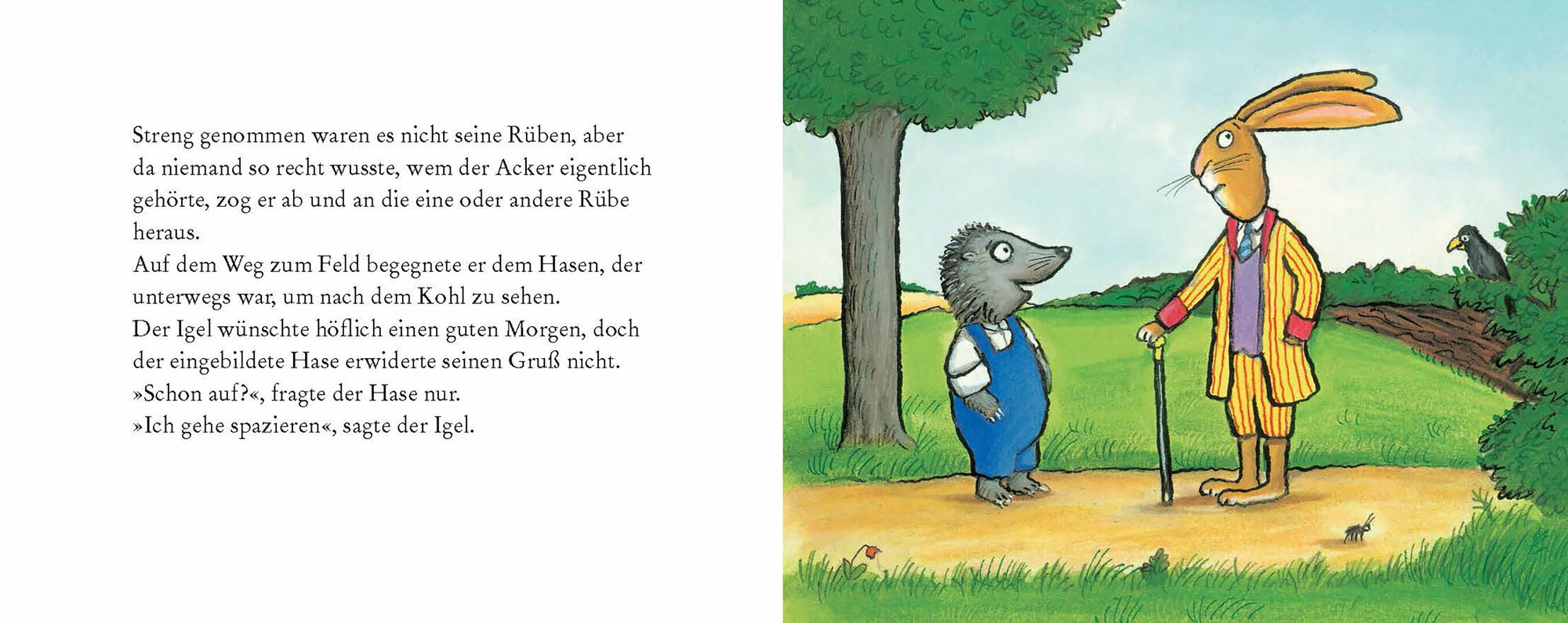 Axel Scheffler hat das Grimmsche Marchen von Hase und Igel nicht nur nacherzahlt, sondern auch ein wenig entscharft, denn in seiner Fassung bleibt der Hase am Leben! Und der Igel und seine Frau tragen ihren Gewinn nach Hause und veranstalten mit ihren Kindern auf einem grunen Hugel ein Picknick.