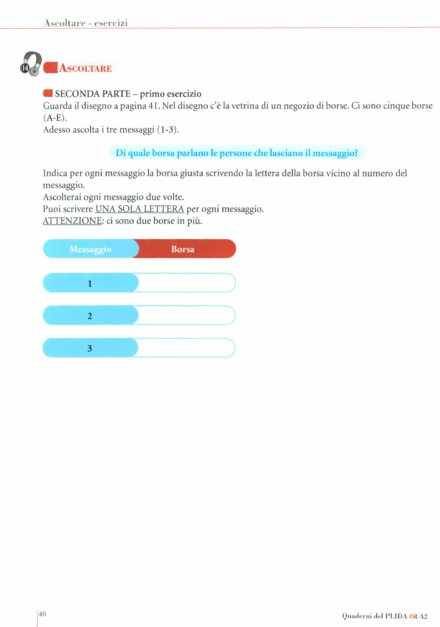 I Quaderni del PLIDA sono declinati in 6 volumi, uno per ognuno dei livelli in cui e articolata la certificazione PLIDA (A1 - A2 - B1 - B2 - C1 - C2), uno strumento semplice, pratico e affidabile a disposizione di chiunque voglia cimentarsi in una prova d’esame PLIDA o semplicemente esercitarsi con il proprio italiano.