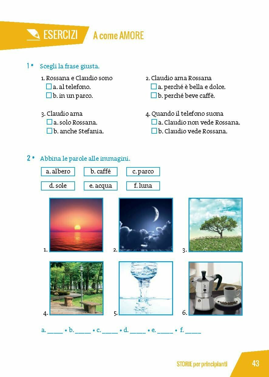 A come "amore", B come "bello", C come "caffe"… ogni lettera una parola, ogni parola una storia, breve o brevissima, che permette allo studente principiante assoluto di leggere una storia in italiano. Le storie sono ambientate in citta e luoghi tipici dell’Italia, per fornire anche qualche elemento di cultura italiana.