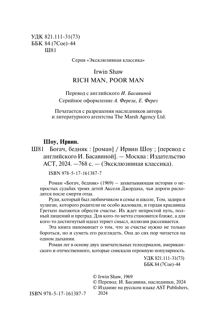Книга: Богач бедняк (Шоу Ирвин); ООО "Издательство Астрель", 2024