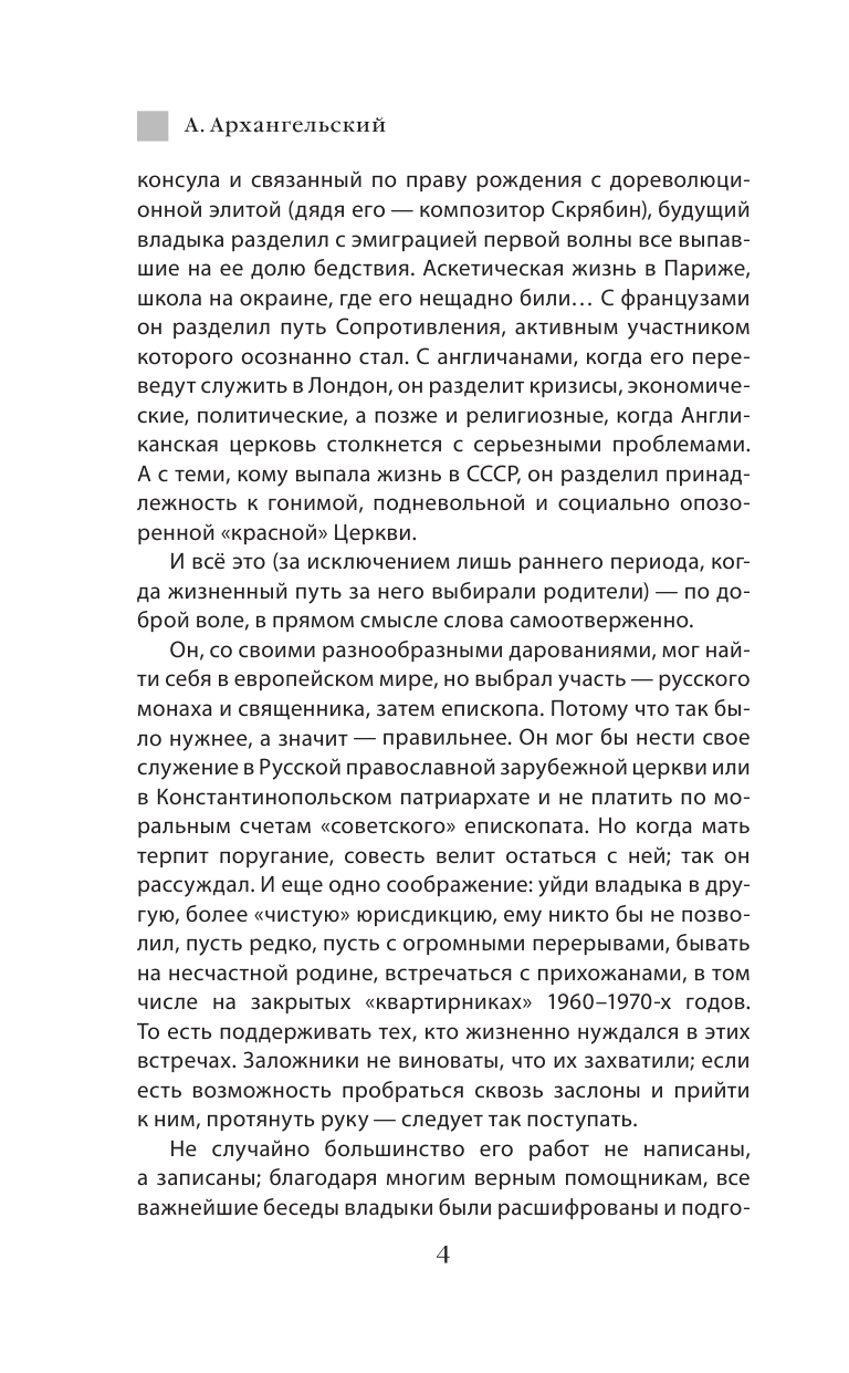 Митрополит Антоний Сурожский по праву считается одним из наиболее известных православных мыслителей ХХ века, а его немногочисленные приезды в Россию каждый раз становились настоящими событиями религиозной жизни. Так получилось, что человек, живший вдали от своей родины, но постоянно думающий о ней и молящийся за нее, говорил о том, что отзывалось в сердце множества людей всего мира чем-то своим, родным и понятным. Прочитав за всю жизнь бесчисленное множество лекций, проводя беседы и проповеди, он никогда не писал свои выступления заранее — подготовкой к ним была сама его жизнь, его бесценный накопленный опыт.