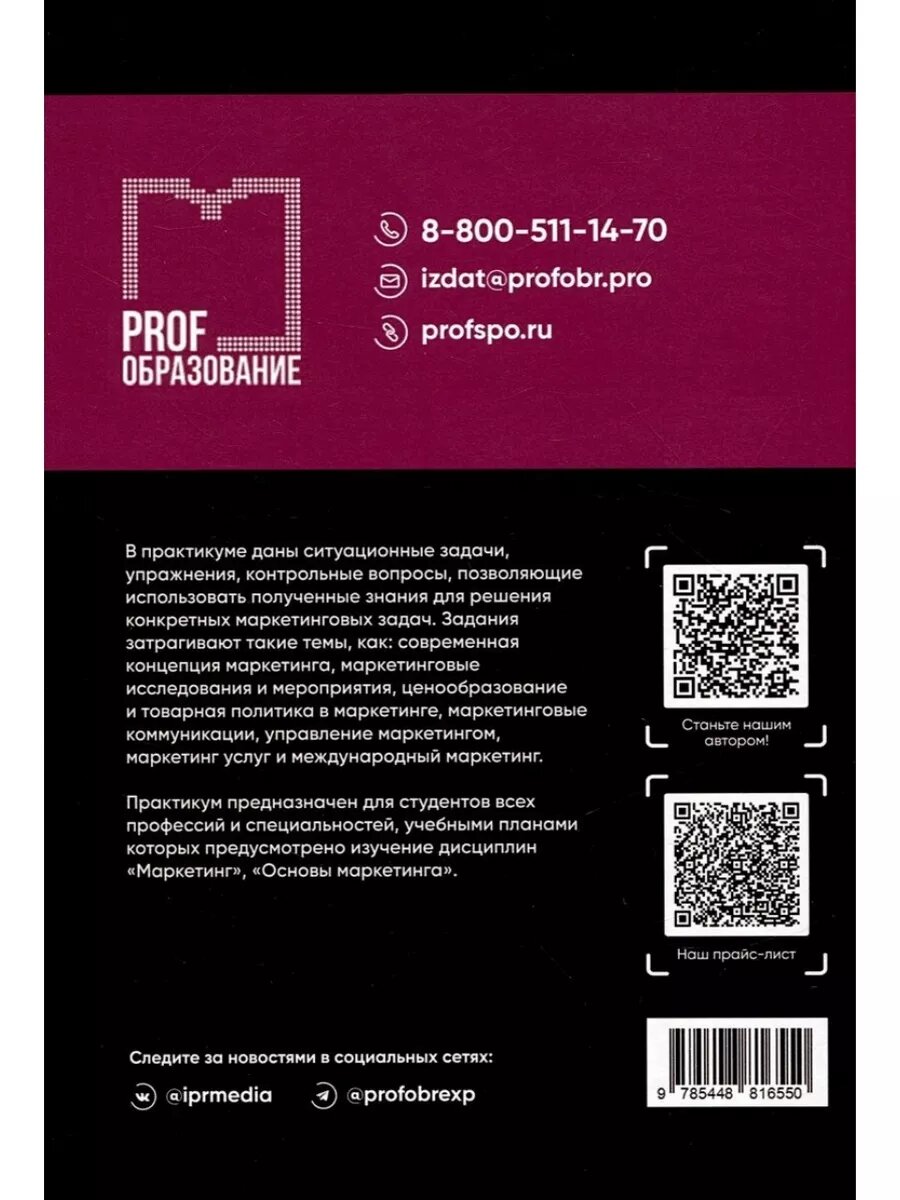 Практикум предназначен для студентов всех профессий и специальностей, учебными планами которых предусмотрено изучение дисциплин «Маркетинг», «Основы маркетинга».