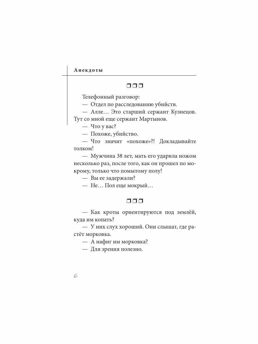 В нем вы найдете как свежие анекдоты, например, про улитку, так и ставшие классикой, но не потерявшие своей актуальности, смешные истории.