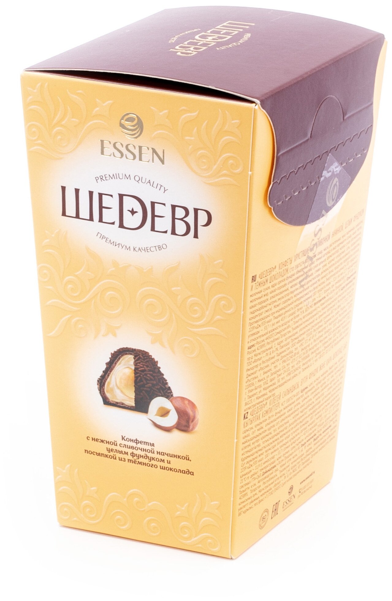 На сегодняшний день товар «Конфеты Essen Шедевр со сливочной начинкой целым фундуком и темным шоколадом 147 г» можно купить с кешбеком в 1 магазине: Яндекс.Маркет