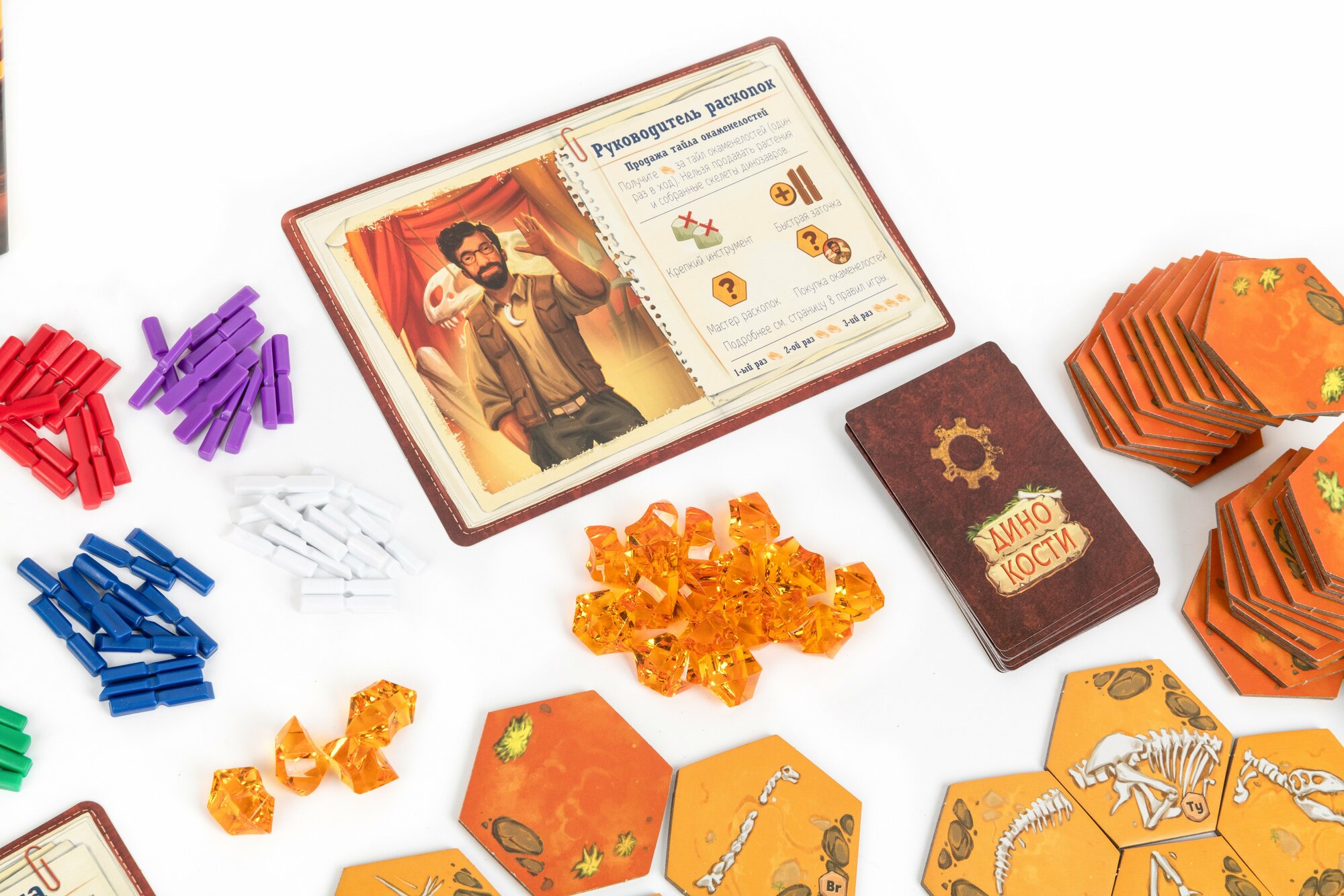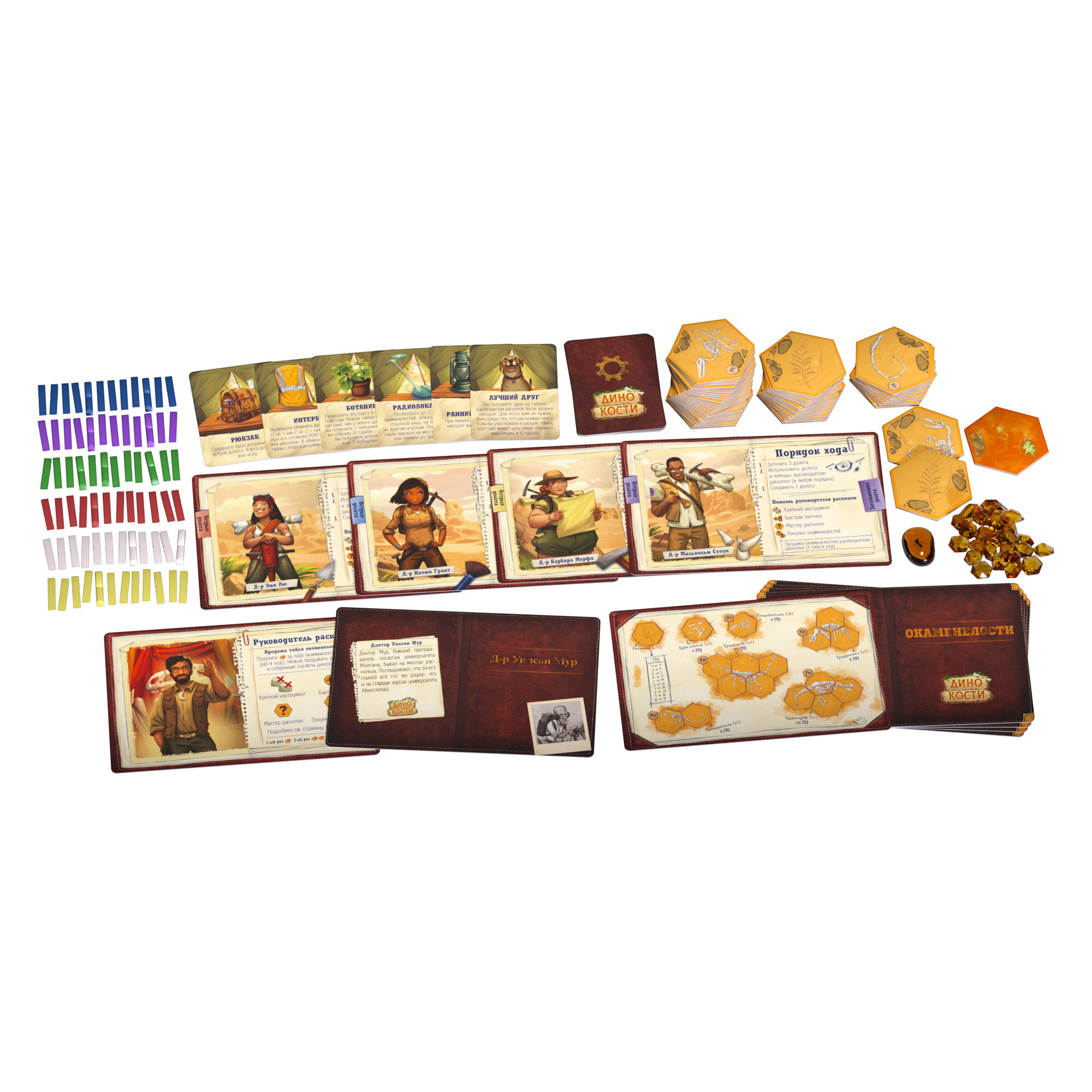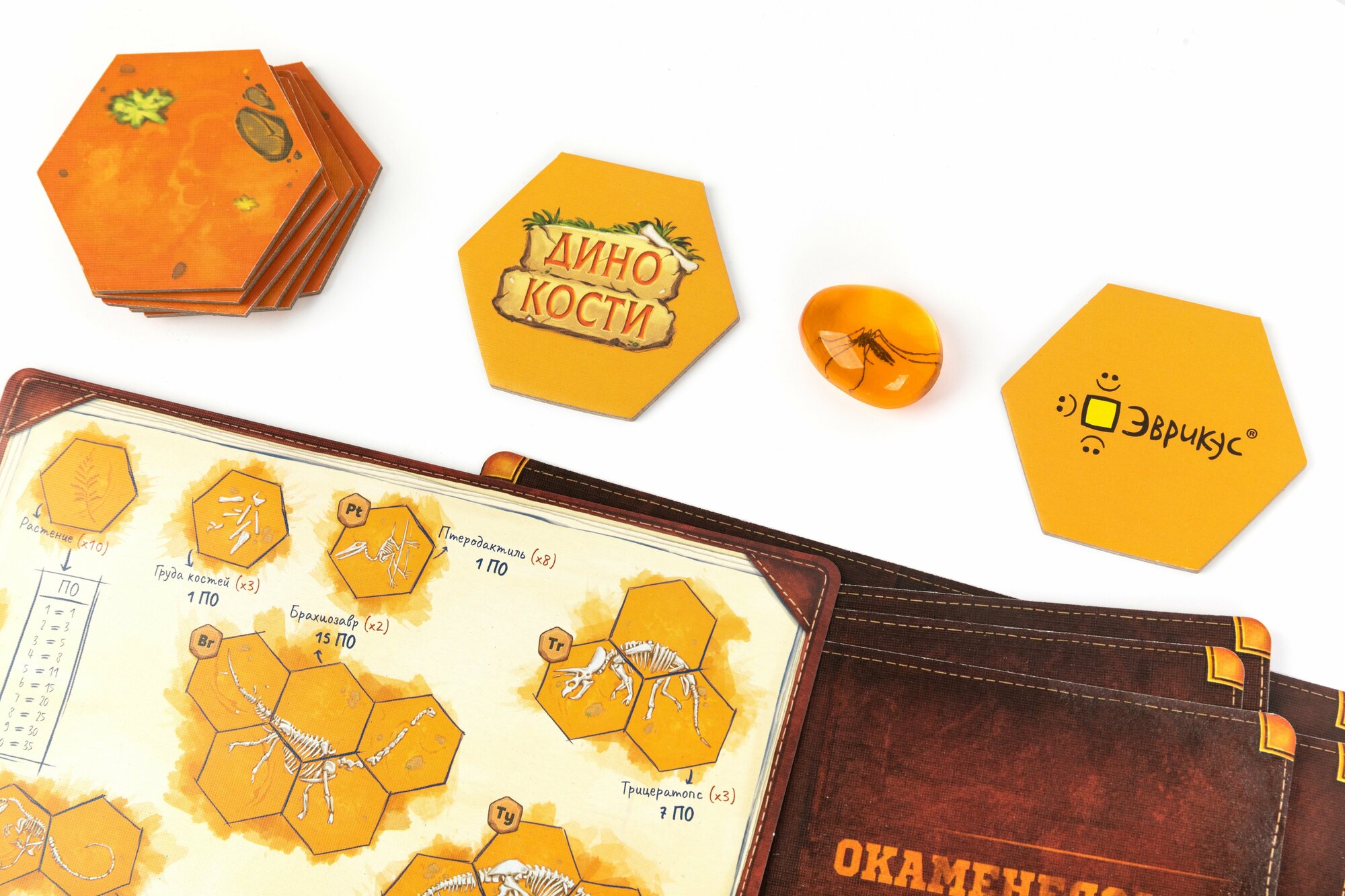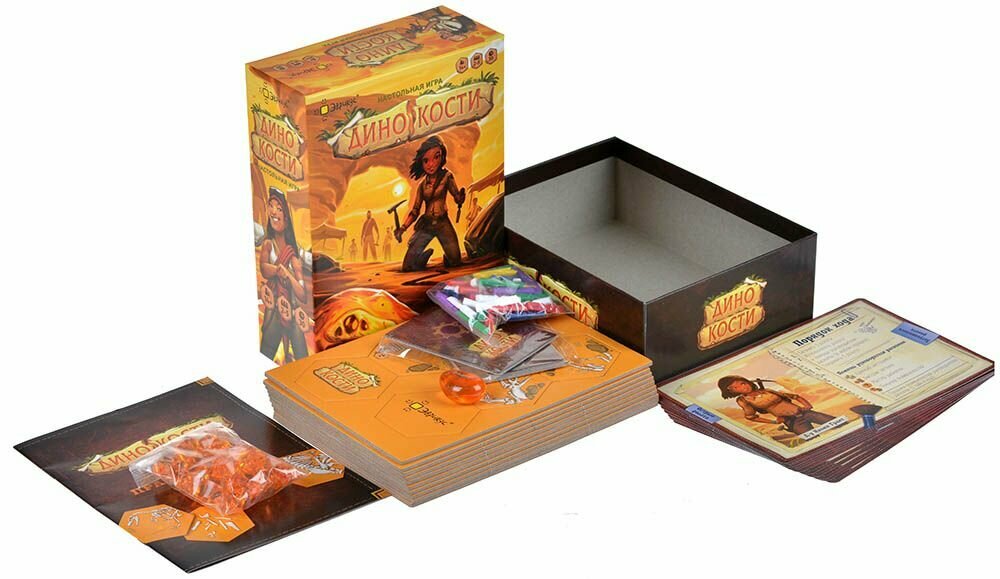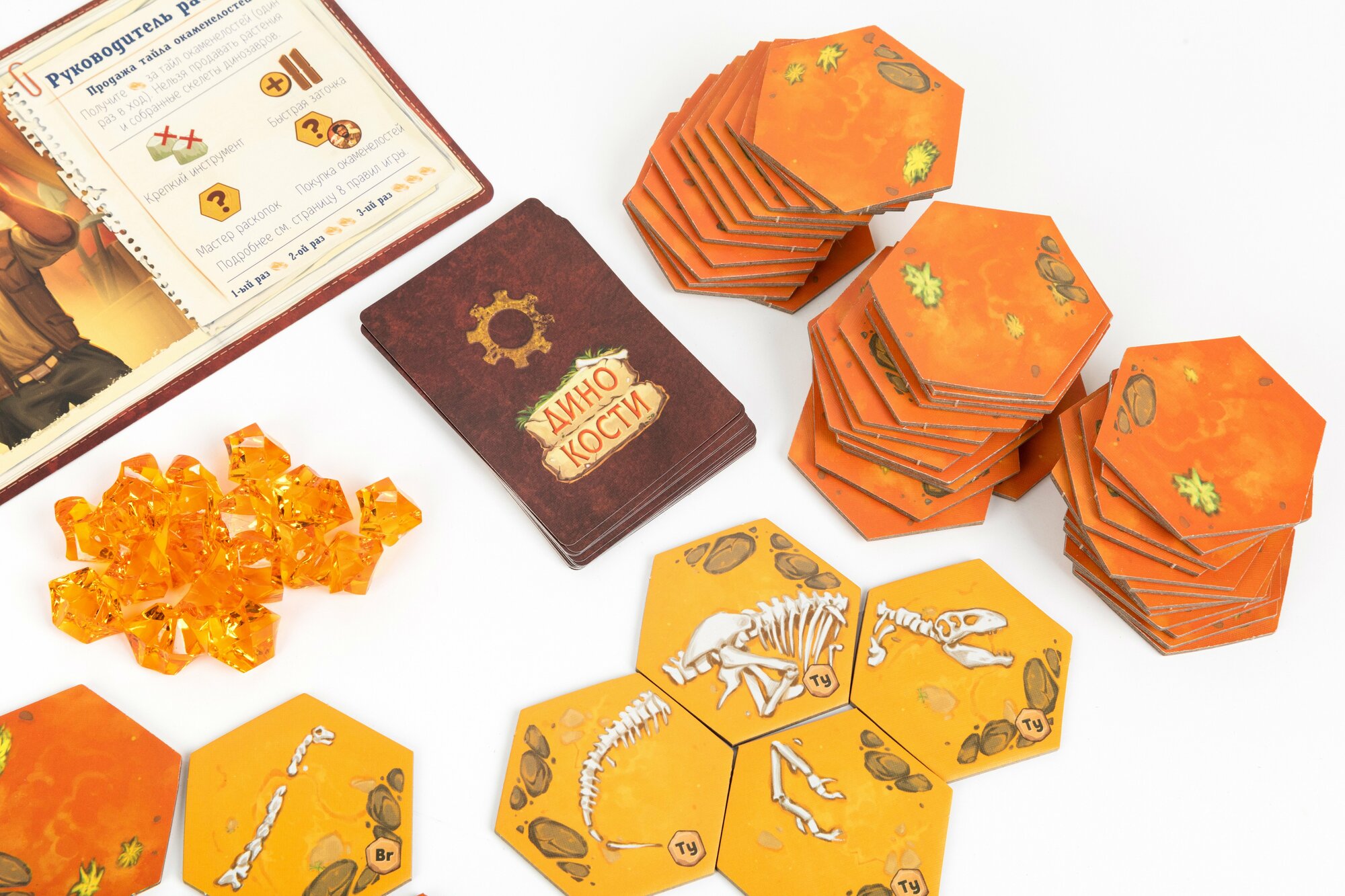 | Комплектация | • 58 тайлов окаменелостей • 72 долота • 6 планшетов раскопок • 12 карт снаряжения • 5 памяток окаменелостей • 20 кристаллов янтаря • Маркер 1-го игрока • Планшет руководителя раскопок • Правила игры |
