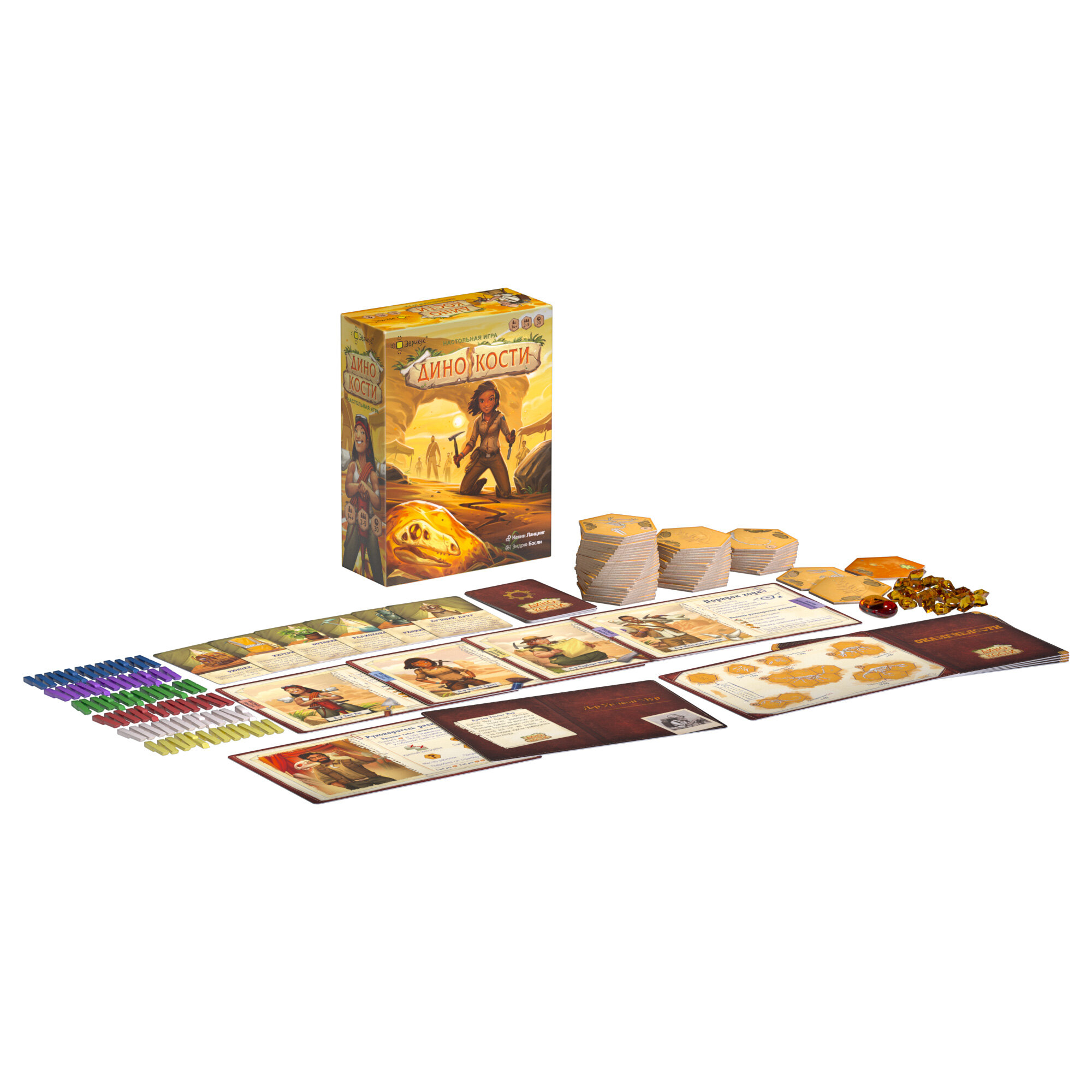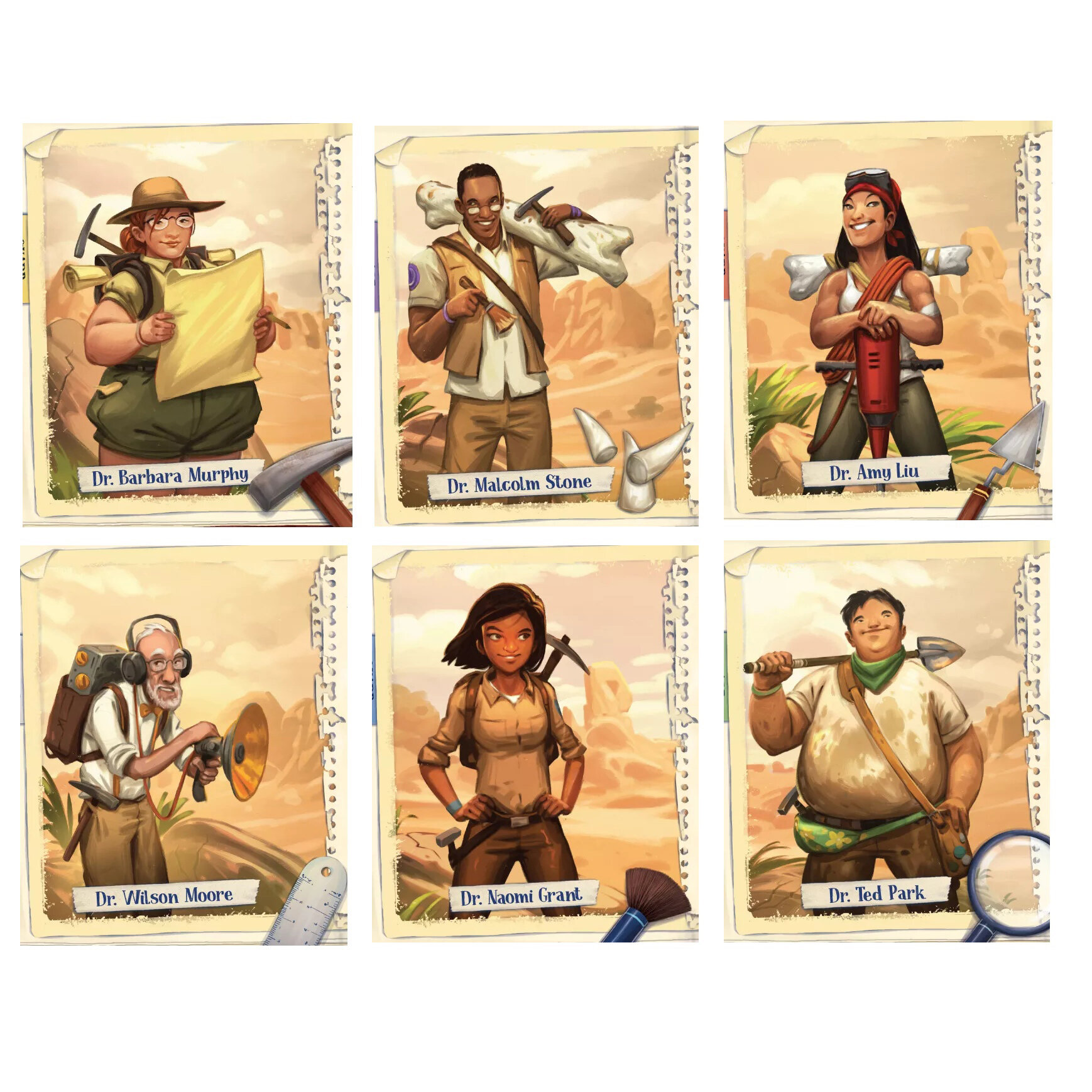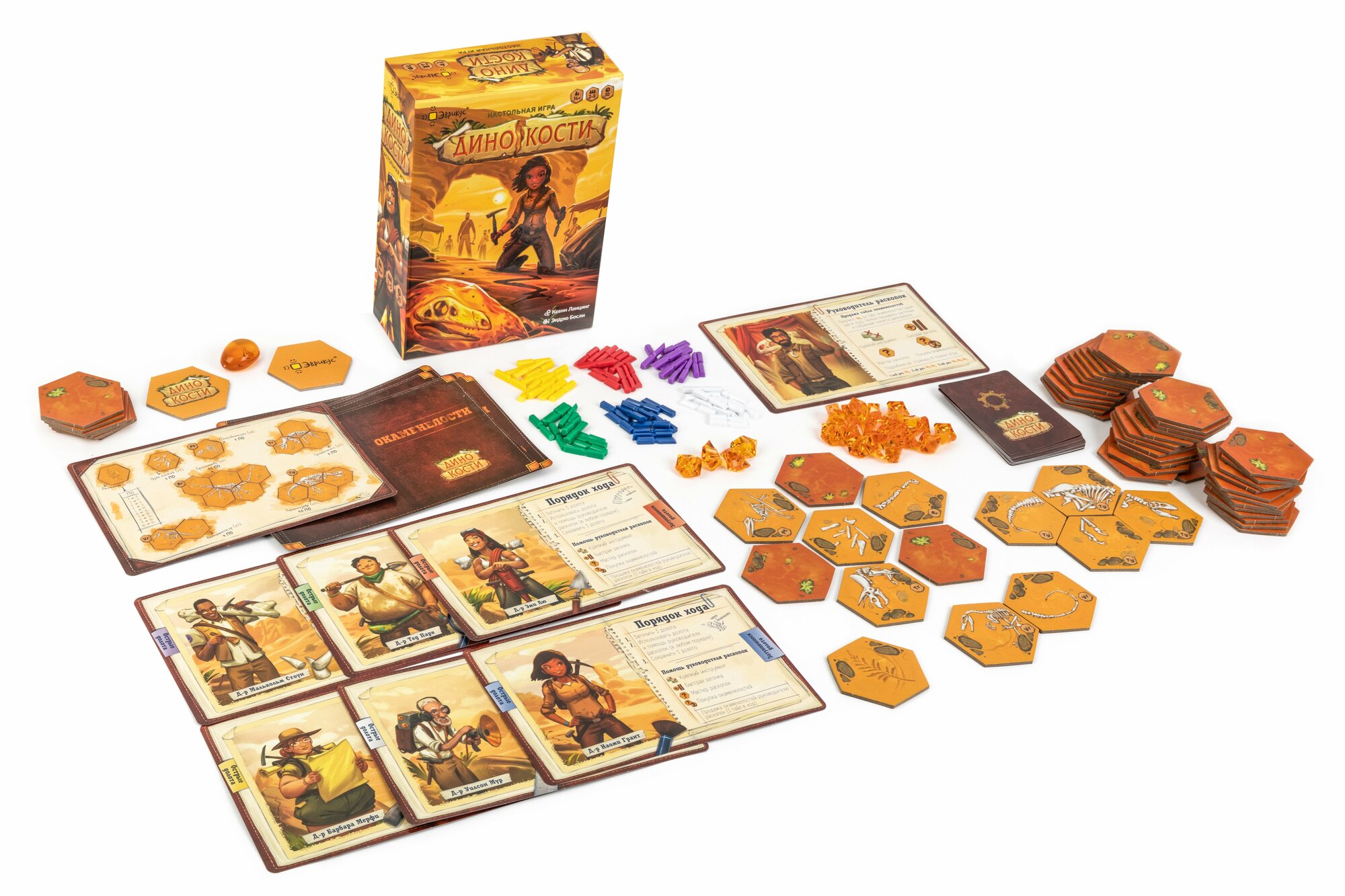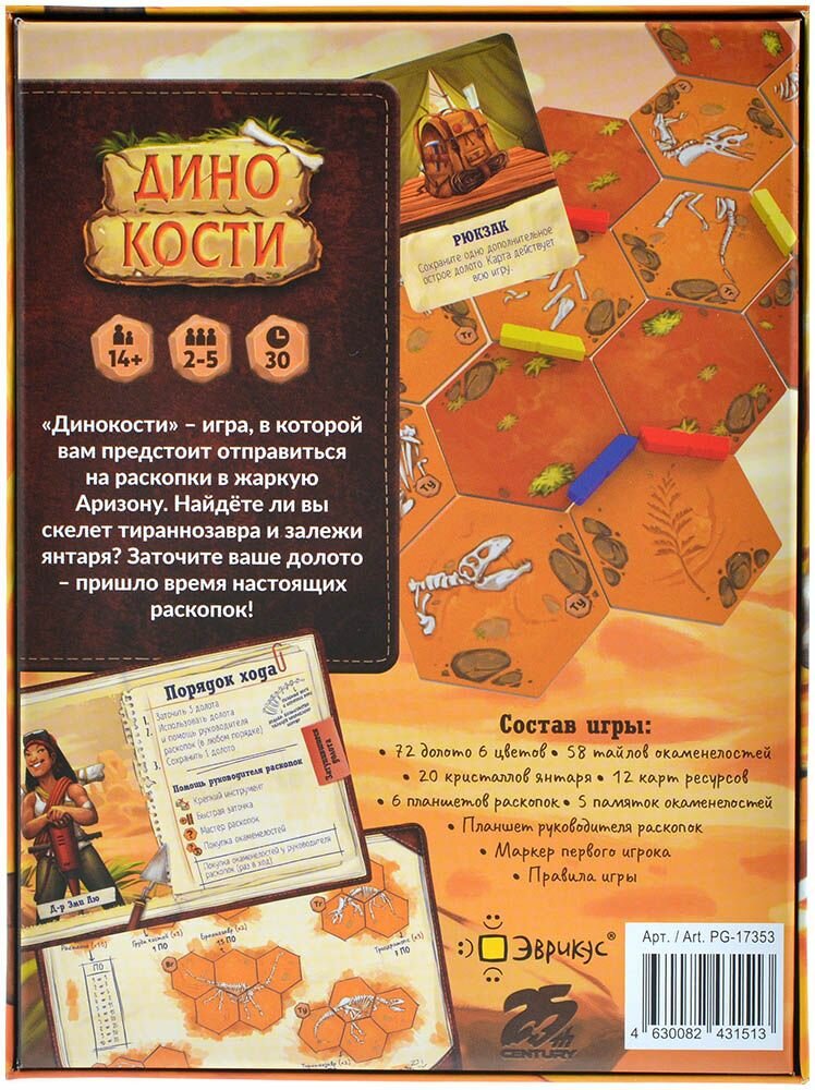 | Комплектация | • 58 тайлов окаменелостей • 72 долота • 6 планшетов раскопок • 12 карт снаряжения • 5 памяток окаменелостей • 20 кристаллов янтаря • Маркер 1-го игрока • Планшет руководителя раскопок • Правила игры |