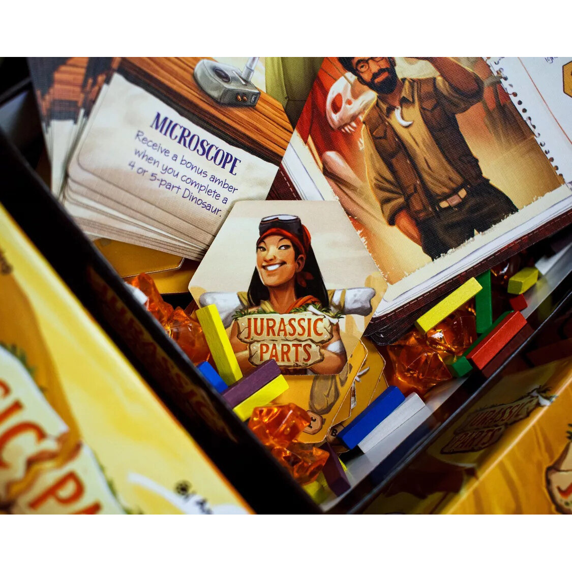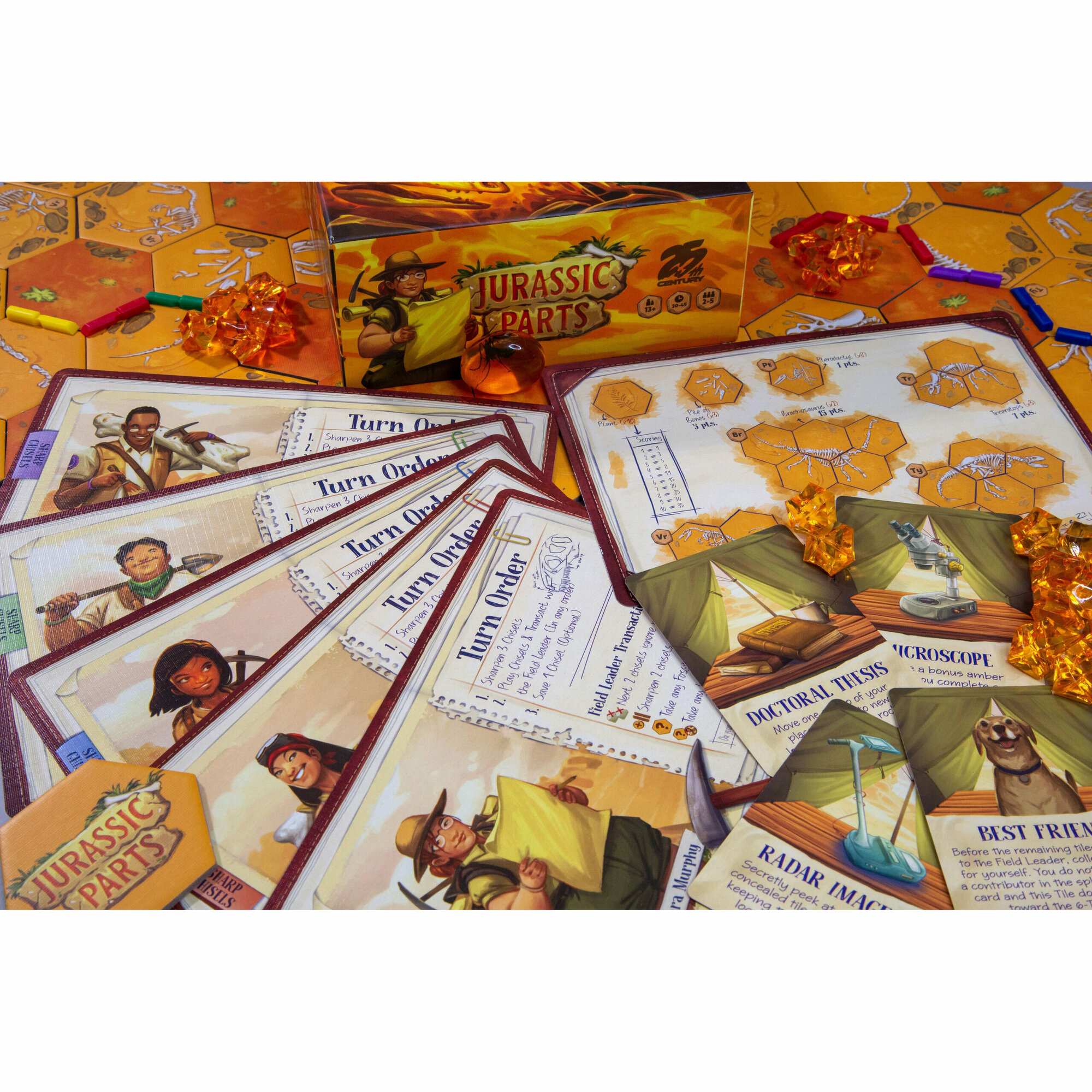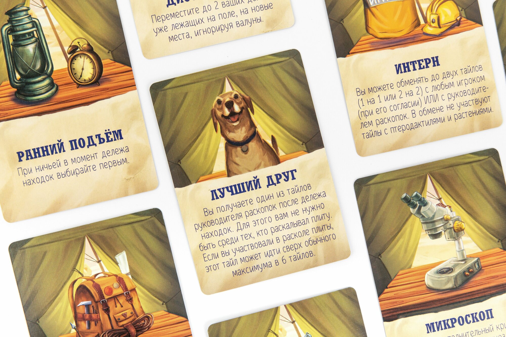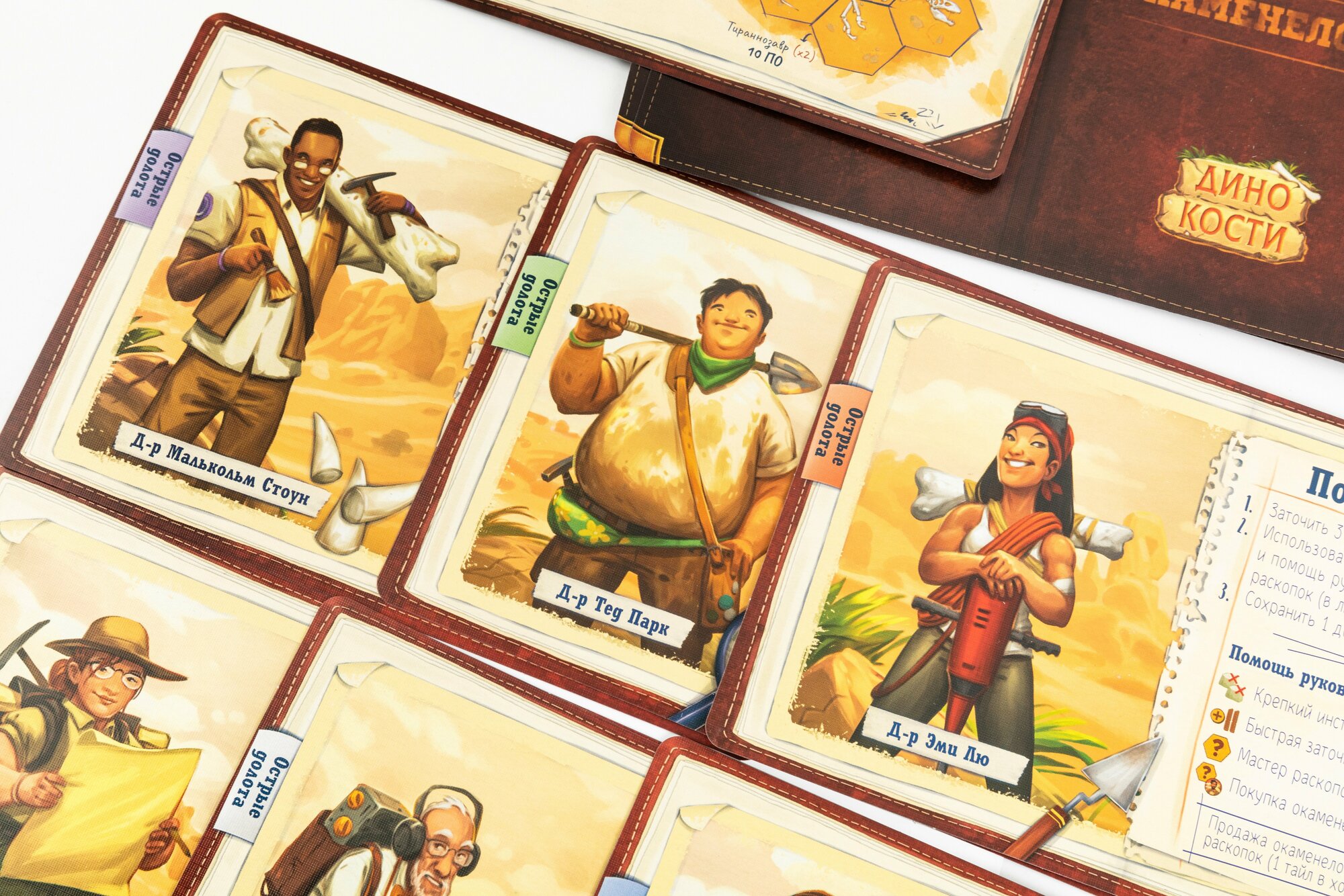 | Комплектация | • 58 тайлов окаменелостей • 72 долота • 6 планшетов раскопок • 12 карт снаряжения • 5 памяток окаменелостей • 20 кристаллов янтаря • Маркер 1-го игрока • Планшет руководителя раскопок • Правила игры |