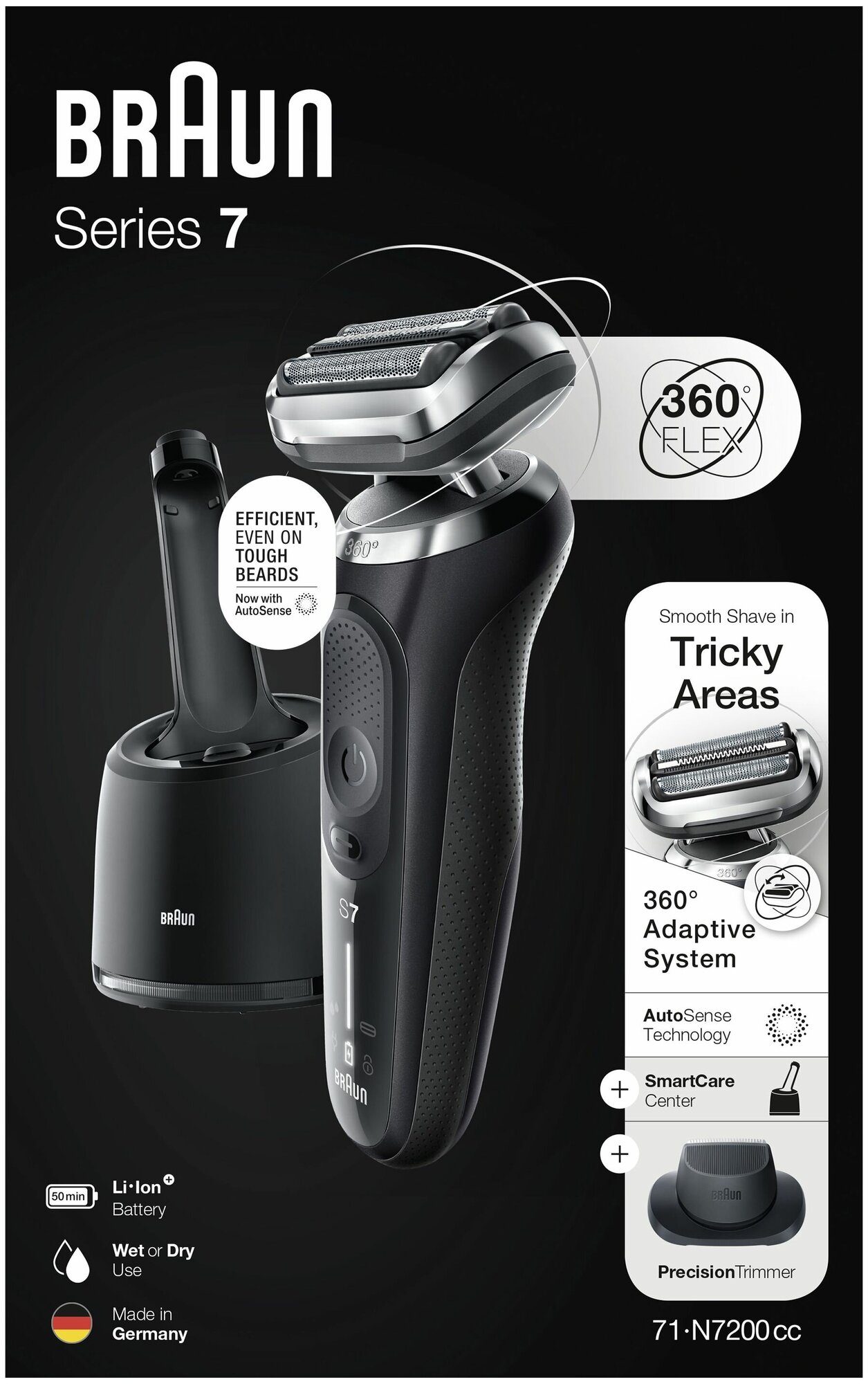 Электробритва Braun Series 7 71-N7200cc Grey с системой адаптации 360° Flex безупречно повторяет контуры лица и адаптируется к любой поверхности. Центр SmartCare заряжает, очищает и смазывает одним нажатием кнопки. Бритвы данной серии 100% водонепроницаемые и предназначен для сухого бритья, с пеной, гелем и в душе. Эргономичная изогнутая форма и идеальное расположение точек касания интерфейса обеспечивают превосходный хват в любом положении бритвы. Меняйте с легкостью свою бритву под любую потребность. Включает насадку Precision Trimmer для усов и бакенбардов. Инновационный мотор считывает плотность вашей щетины и адаптирует мощность бритвы 13 раз в секунду, обеспечивая правильное распределение энергии даже с более густой щетиной. Бритва сама повторяет любую поверхность, чтобы вы брились с удовольствием с системой 360° Flex. Литий-ионный аккумулятор обеспечивает до 3 недель бритья и имеет функцию быстрой 5-минутной