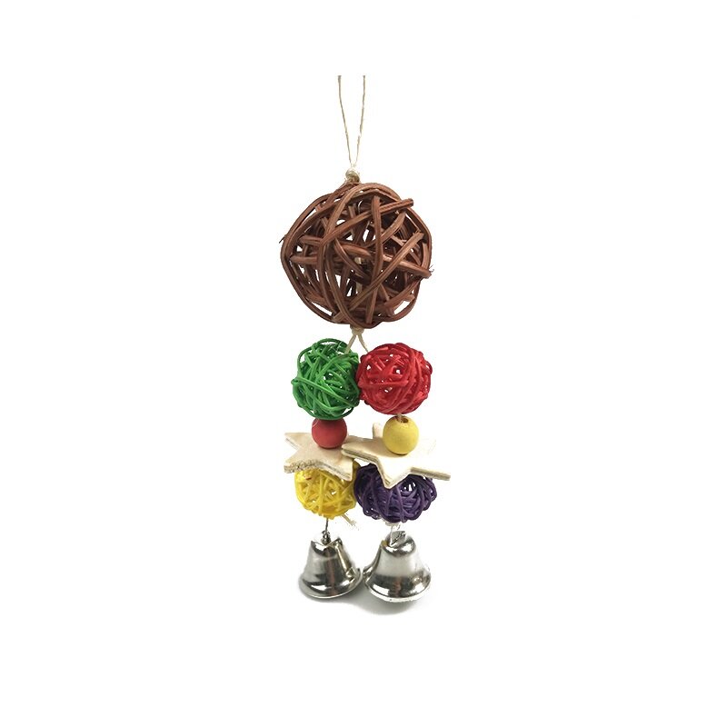 Игрушка для попугаев специально предназначенная для разгрызания и раскалывания. Вся конструкция подвешивается на прочный шнурок и раскачивается вперед-назад, как только птица прикасается к ней. Это делает игру настоящим испытанием. Красочные шарики из лоза, нанизанные на пару веревочек, делают этот аксессуар прекрасным украшением любой клетки. Внизу игрушки закреплены два звонких колокольчика, что дополнительно будет радовать вашего пернатого во время игры.