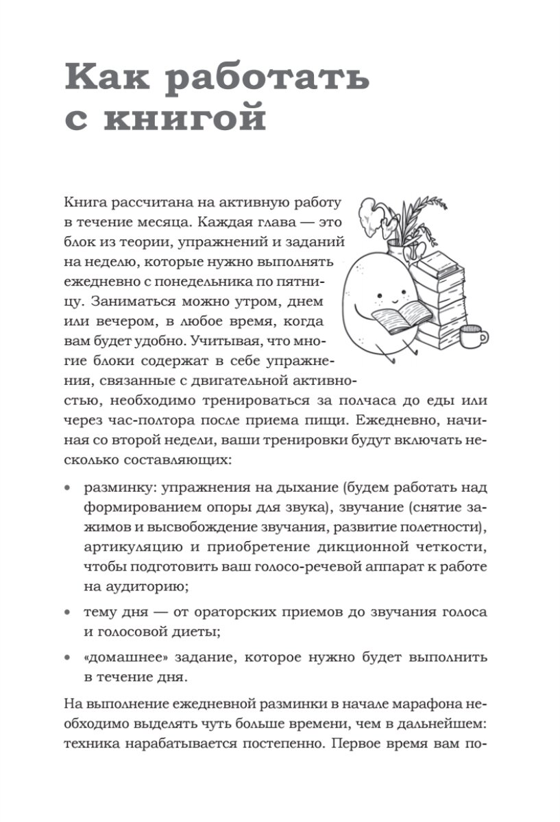 Книга состоит из нескольких частей, каждая из которых посвящена определенной теме, связанной с развитием речи и голоса. Автор предлагает разнообразные упражнения и техники, которые помогут улучшить свои навыки общения.