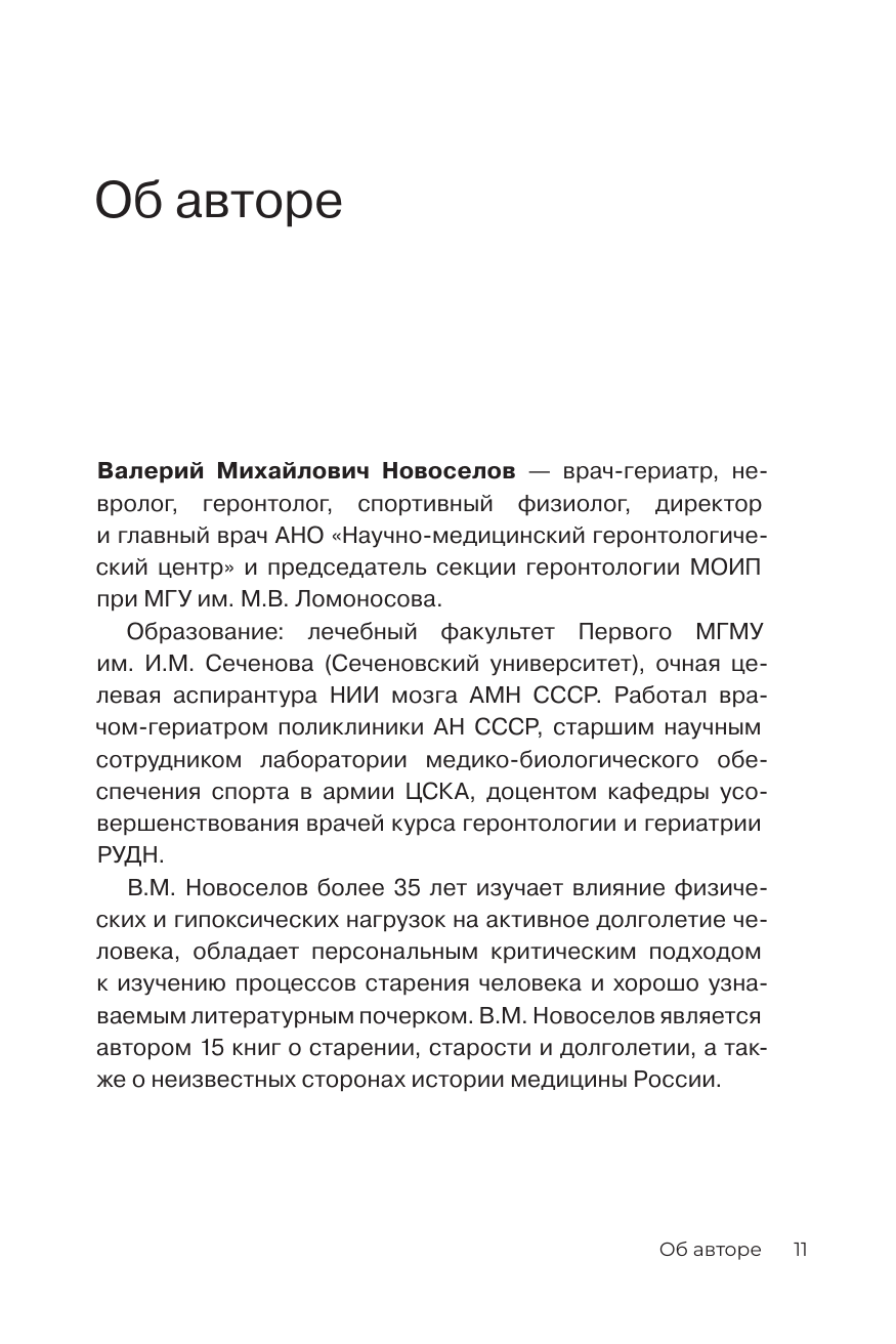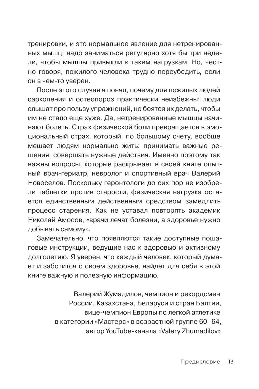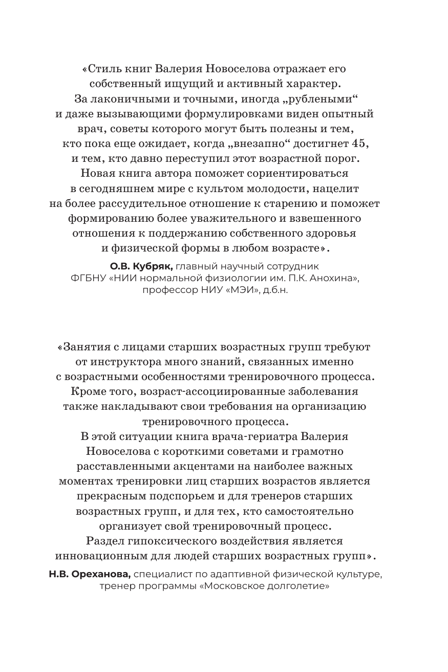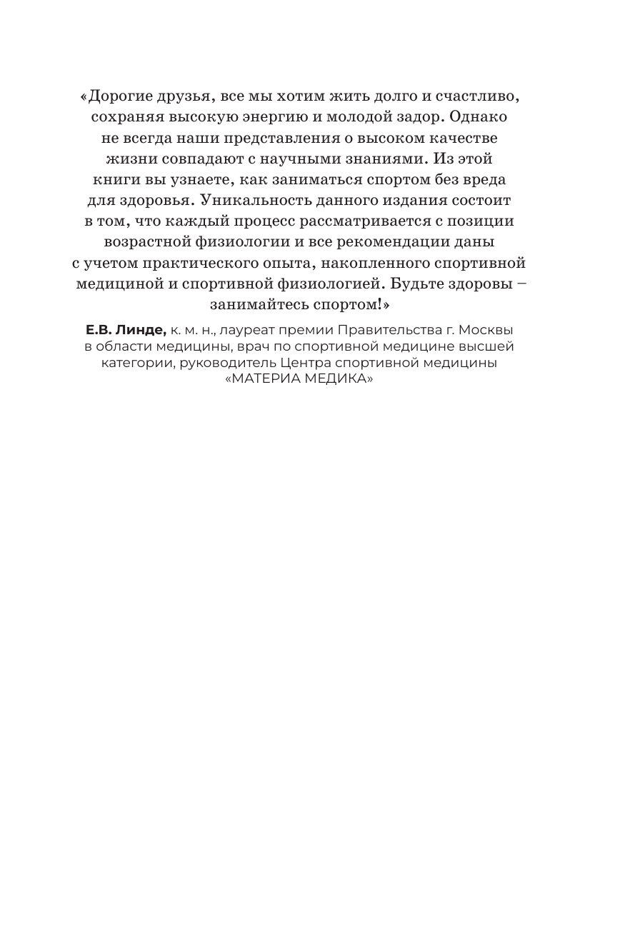 «Дорогие друзья, все мы хотим жить долго и счастливо, сохраняя высокую энергию и молодой задор. Однако не всегда наши представления о высоком качестве жизни совпадают с научными знаниями. Из этой книги вы узнаете, как заниматься спортом без вреда для здоровья. Уникальность данного издания состоит в том, что каждый процесс рассматривается с позиции возрастной физиологии и все рекомендации даны с учетом практического опыта, накопленного спортивной медициной и спортивной физиологией. Будьте здоровы — занимайтесь спортом!» — Е. В. Линде, к. м. н., лауреат премии Правительства г. Москвы в области медицины, врач по спортивной медицине высшей категории, руководитель Центра спортивной медицины «МАТЕРИА МЕДИКА»
