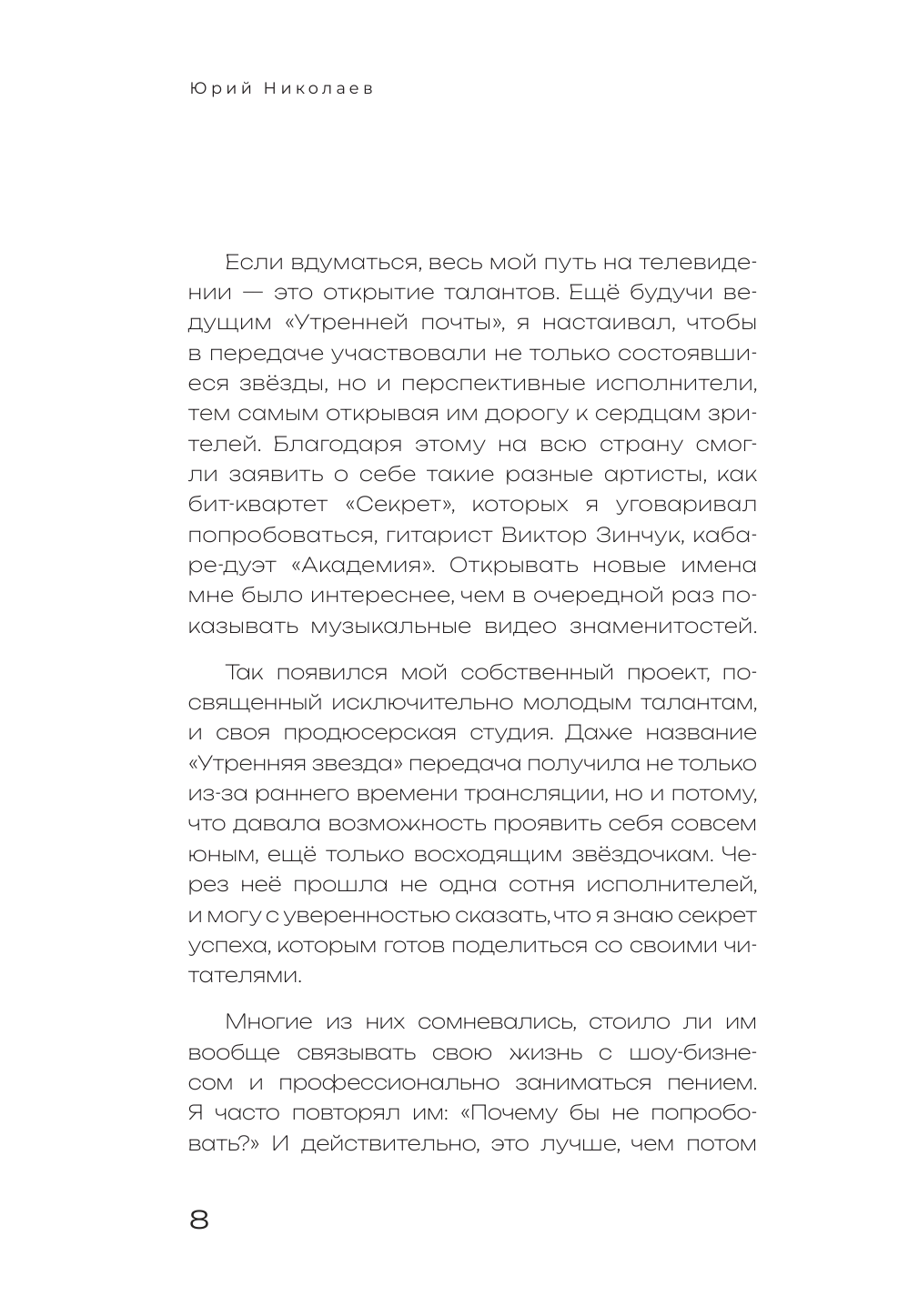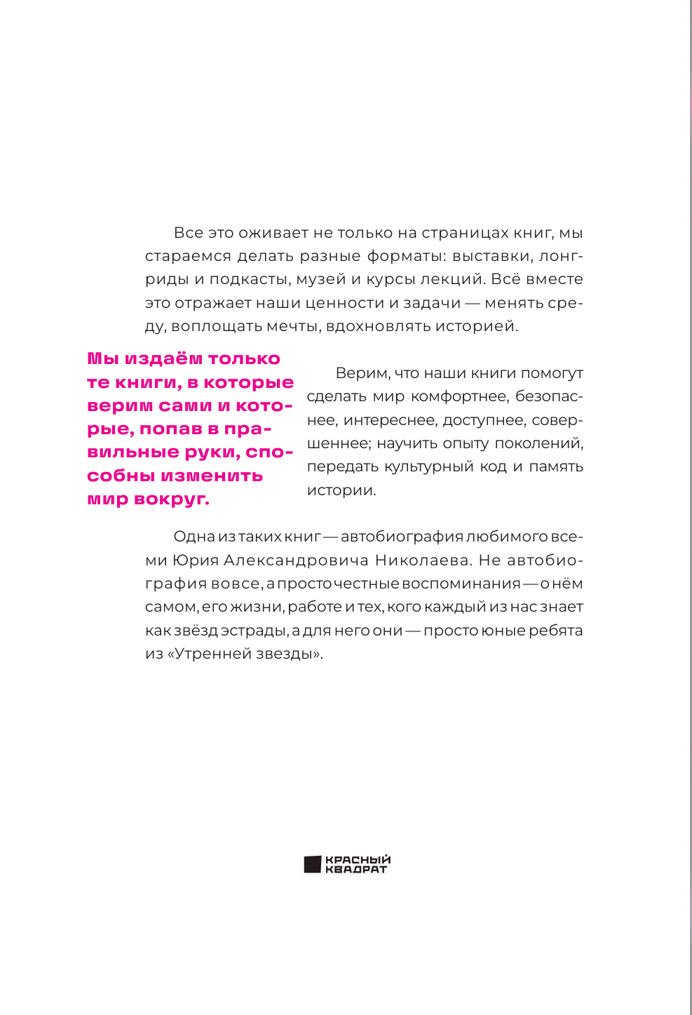 Книга, которую вы держите в руках, — не просто автобиография Юрия Александровича. Это честный рассказ наставника, без преувеличения, почти всех звёзд нашей эстрады — о жизни, дружбе, работе. О легендарной «Утренней звезде», о том, как сегодняшние звёзды приходили на сцену юными и наивными ребятами. Это советы от человека, которому мы обязаны целой индустрией поиска детских вокальных талантов.