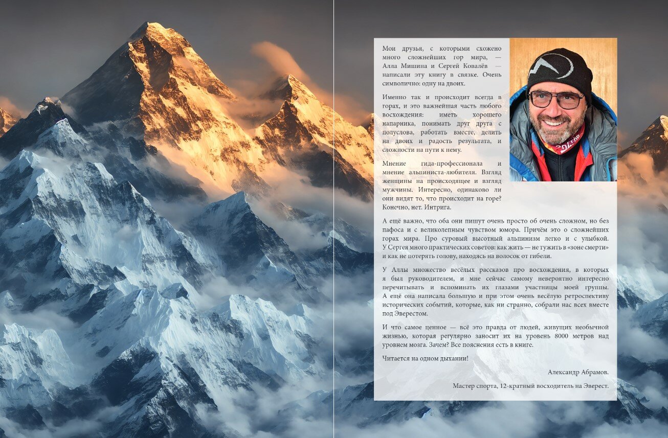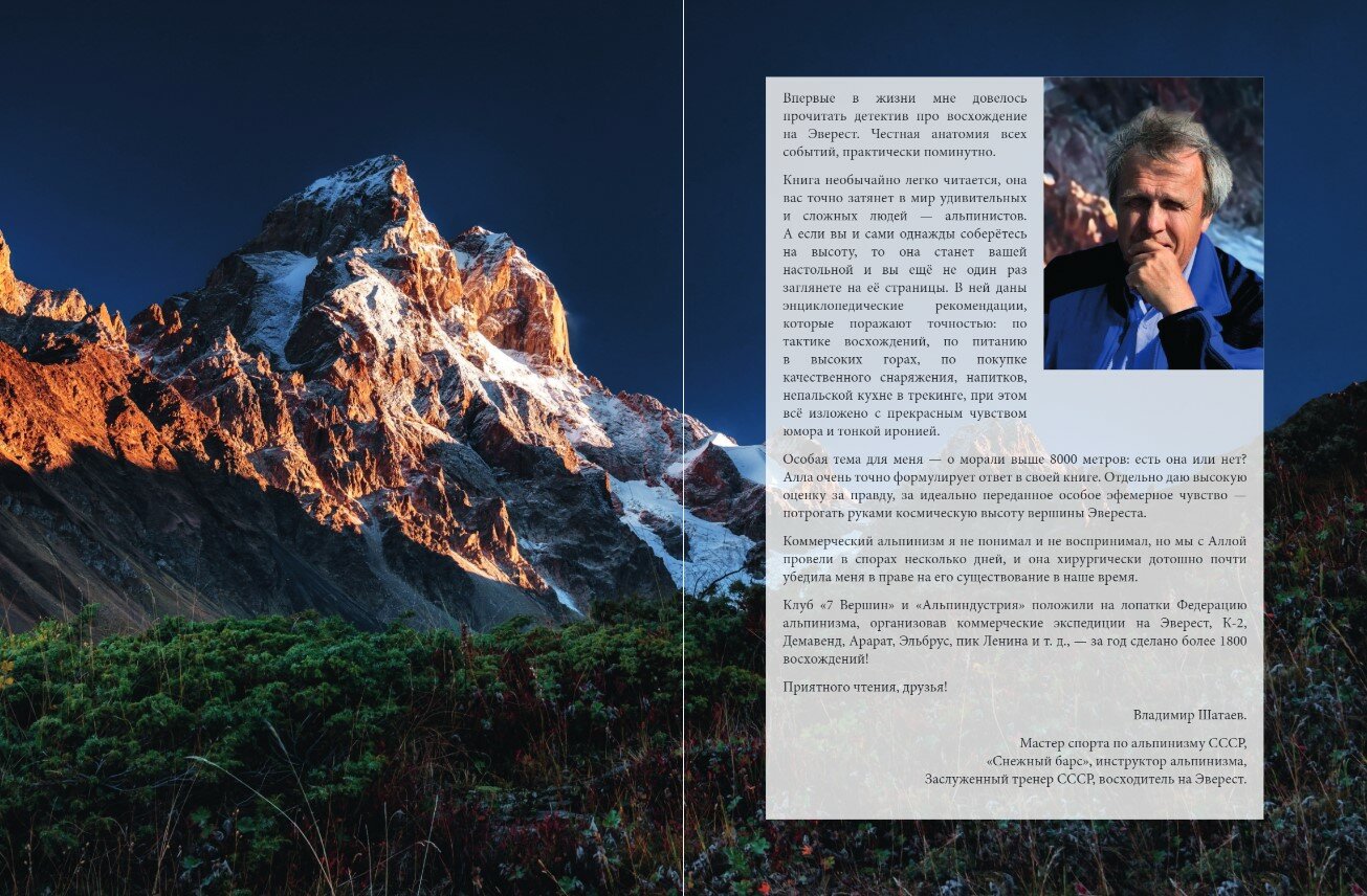 «Впервые в жизни мне довелось прочитать детектив про восхождение на Эверест. Честная анатомия всех событий, практически поминутно. Книга необычайно легко читается, она вас точно затянет в мир удивительных и сложных людей — альпинистов. А если вы и сами однажды соберетесь на высоту, то она станет вашей настольной, и вы еще не один раз заглянете на ее страницы. В ней даны энциклопедические рекомендации, которые поражают точностью: по тактике восхождений, по питанию в высоких горах, по покупке качественного снаряжения, напитков, непальской кухне в трекинге, при этом все изложено с прекрасным чувством юмора и тонкой иронией». — Владимир Шатаев, мастер спорта по альпинизму СССР, «Снежный барс», инструктор альпинизма, Заслуженный тренер СССР, восходитель на Эверест