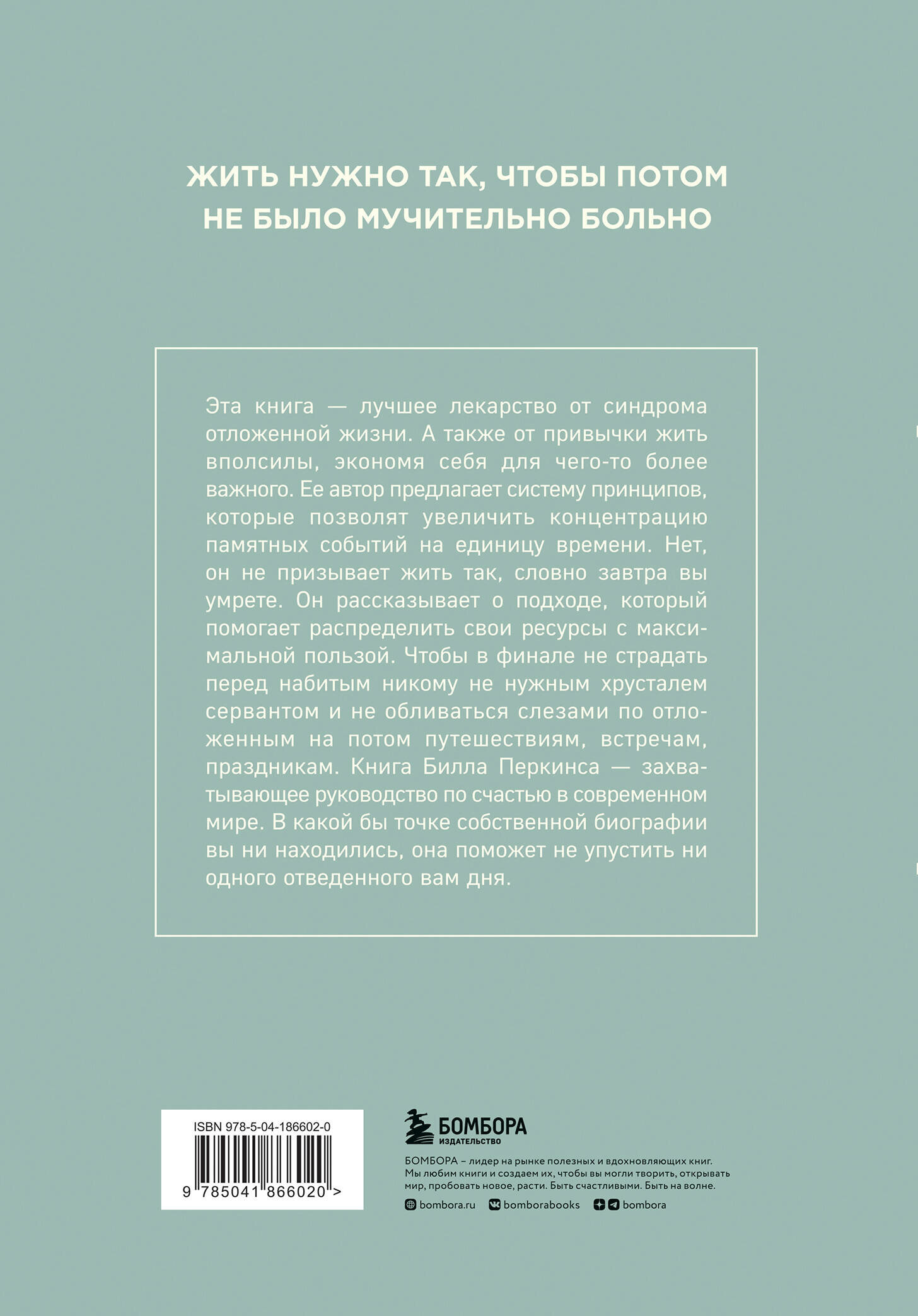 Эта книга — лучшее лекарство от синдрома отложенной жизни. А также от привычки жить вполсилы, экономя себя для чего-то более важного. Ее автор предлагает систему принципов, которые позволят увеличить концентрацию памятных событий на единицу времени. Нет, он не призывает жить так, словно завтра вы умрете. Он рассказывает о подходе, который помогает распределить свои ресурсы с максимальной пользой. Чтобы в финале не страдать перед набитым никому не нужным хрусталем сервантом и не обливаться слезами по отложенным на потом путешествиям, встречам, праздникам. Книга Билла Перкинса — захватывающее руководство по счастью в современном мире. В какой бы точке собственной биографии вы ни находились, она поможет не упустить ни одного отведенного вам дня.