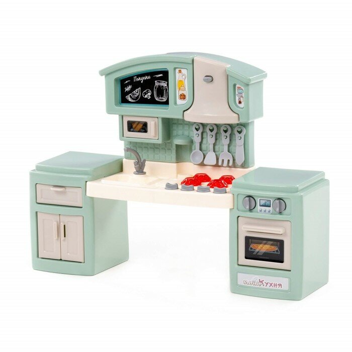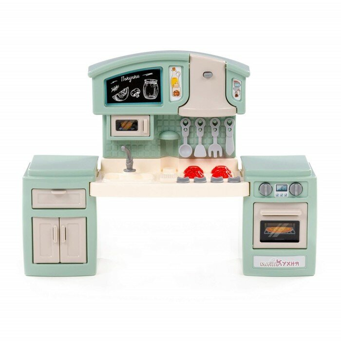 Мини-кухня "Малютка" игрушка для девочек от 3 лет. Конструкция кухни трансформируется путём перестановки нижних шкафов в соответствующие пазы. Вытяжка оснащена подсветкой, которая включается нажатием на кнопку. Подвижные элементы позволяют открывать шкафчики и вращать переключатели. В набор входят 4 позиции кухонных принадлежностей.