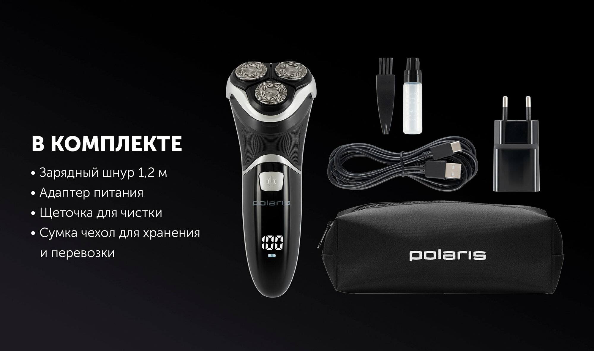 4D СИСТЕМА ПОВТОРЕНИЙ КОНТУРОВ ЛИЦА.3 плавающие роторные головки PRO 5 BLADES.Литиевый аккумулятор с технологией ProLong Li+ 800 мА.Высокоточные ДВОЙНЫЕ лезвия с технологией износостойкости LONG SHAVE EXPERT от POLARIS.Супергладкие кольца.Подходит для сухого и влажного бритья.Степень влагозащиты IPх7.До 120 мин бритья.Полная зарядка 60 мин.Переключатель ВКЛ./ВЫКЛ.Цифровой дисплей.Встроенный триммер для более гладкого бритья и четких линий.Работа от сети и от аккумулятора.Защита от случайного включения.Зарядный кабель 1,2 м и адаптер питания в комплекте.Сумка для хранения и перевозки.Мощность: 8 Вт