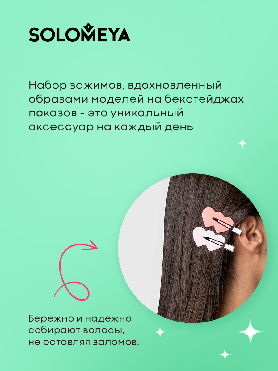 Набор зажимов для волос Solomeya, вдохновлённый образами моделей на бекстейджах модных показов и стильными съемками – это уникальный аксессуар на каждый день. Бережно и надежно собирают волосы, не оставляя заломов.