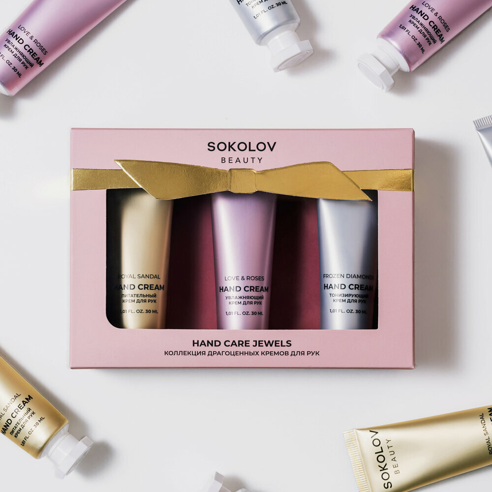 Коллекция драгоценных кремов от SOKOLOV создана для роскошного ухода за руками. Насладитесь насыщенными текстурами и изысканными ароматами. Увлажняющий крем Love & Roses, 30 мл. Крем для рук на цветочных маслах легко впитывается, глубоко увлажняет и придаёт коже нежность розовых лепестков. Пышный аромат роз сочетается с аккордами страстоцвета и оставляет на руках свежесть весеннего сада. Питательный крем Royal Sandal, 30 мл. Крем глубоко питает, придаёт бархатистость и оставляет на коже рук тёплый древесный аромат. Терпкие нотки сандала переплетаются с чувственностью уда – почувствуйте роскошь в повседневном уходе. Тонизирующий крем Frozen Diamonds, 30 мл. Крем для рук на роскошных компонентах обеспечивает глубокий антивозрастной уход. Состав обогащён пудрой бриллианта, которая обновляет кожу рук, делая её более гладкой и упругой.