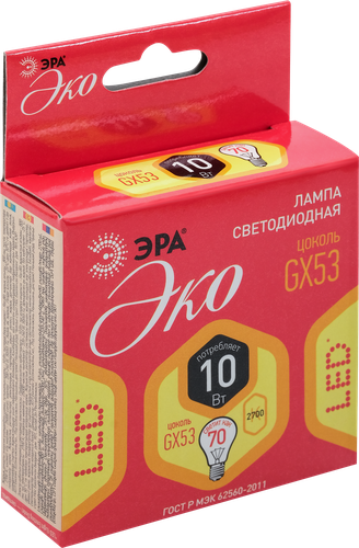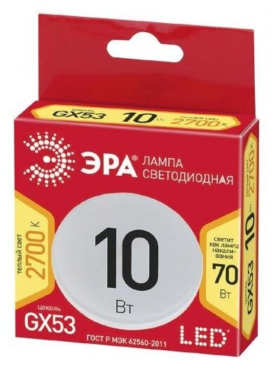 **Лампа светодиодная Эра GX-10W-827-GX53** предназначена для освещения помещений. Она создает яркий ровный свет теплого оттенка, приятный человеческому глазу. Светодиодная лампа позволяет значительно экономить на электричестве. Использовать осветительный прибор можно в люстрах, бра, потолочных, настольных, настенных светильниках. Изделие не нагревается в процессе работы. Оно характеризуется мгновенным включением и выключением.