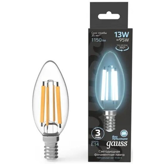 На сегодняшний день товар «Лампа светодиодная Gauss Fil свеча Е14 13 Вт 1150 Лм 4100 К нейтральный белый свет» можно купить с кешбеком в 1 магазине: Яндекс.Маркет
