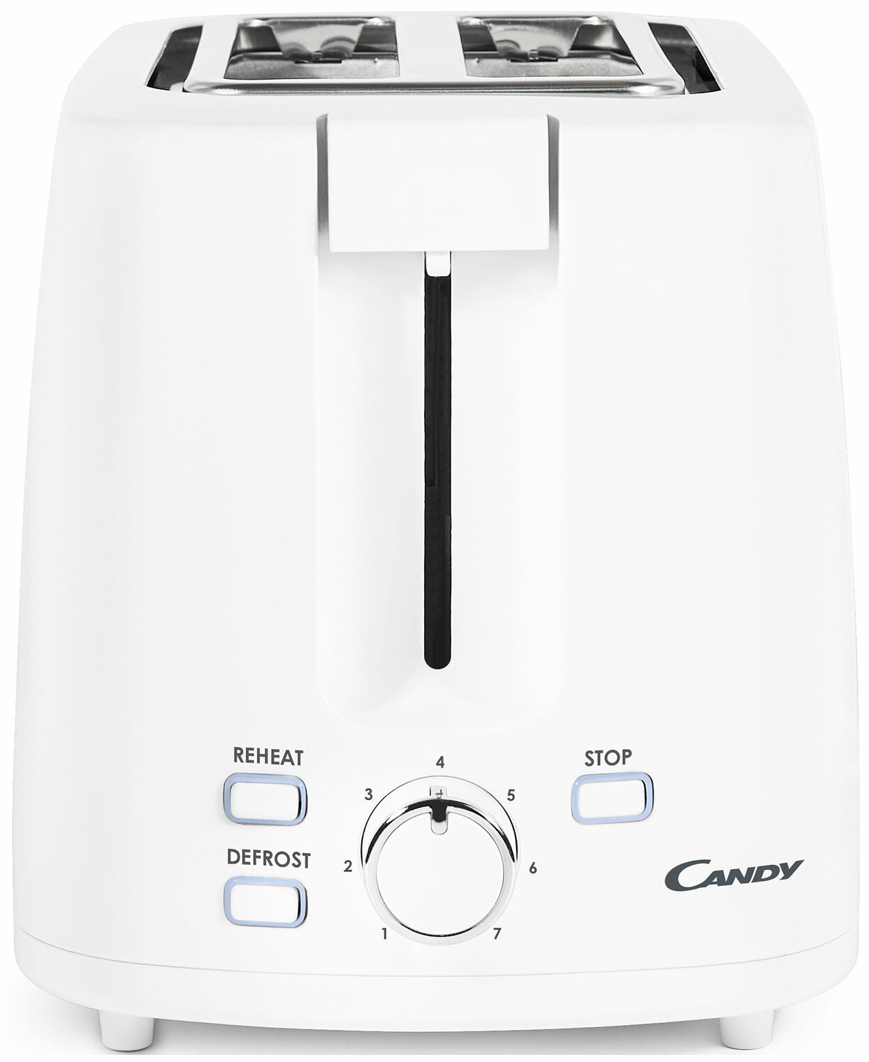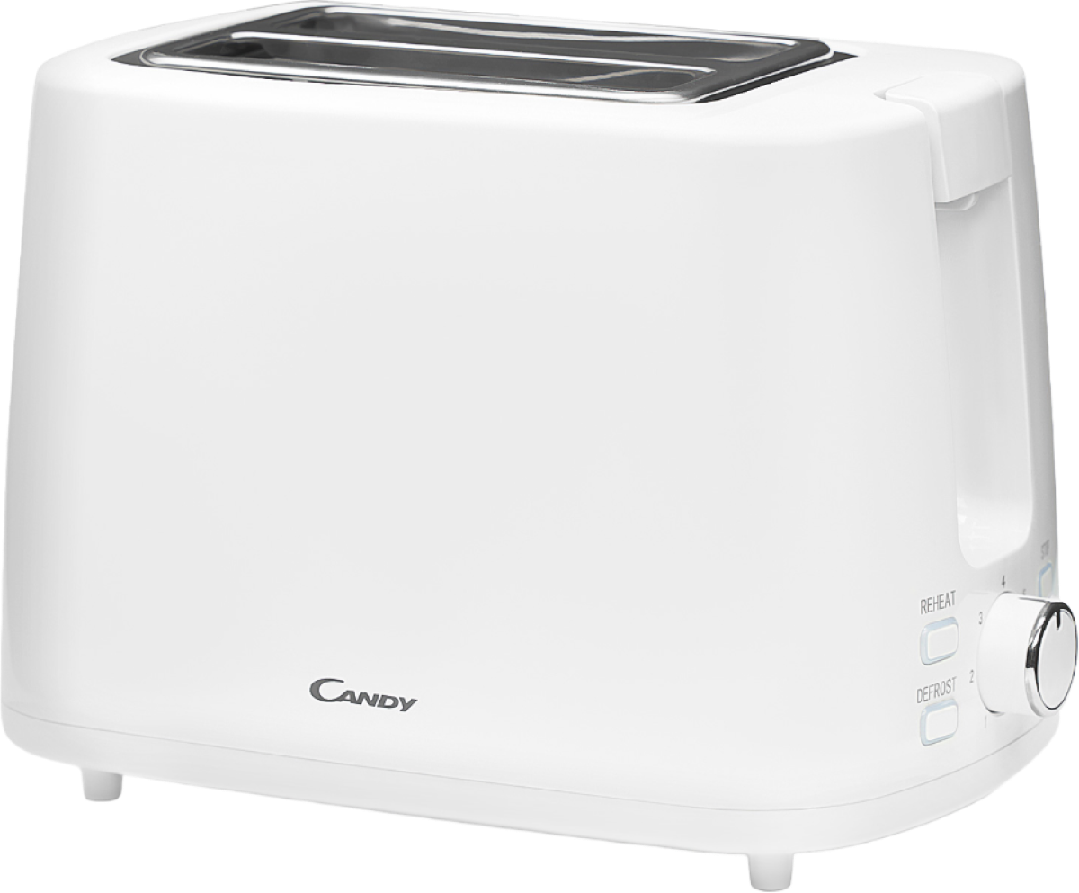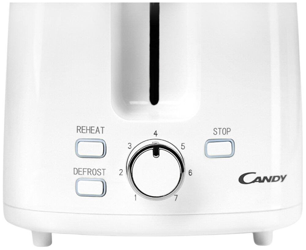 Тостер Candy выполнен из пластика, окрашен в классический белый цвет. На корпусе прибора расположены кнопки управления, индикаторы и регулятор степени прожарки (тостер поддерживает семь степеней). Прибор оснащен двумя отсеками размером 135x35 мм для приготовления тостов. Эта модель обладает дополнительными функциями размораживания и подогрева. Предусмотрен съемный поддон для крошек, расположенный в нижней части устройства. Тостер оснащен прорезиненными ножками, которые придают ему устойчивость во время работы. Мощность прибора составляет 930 Вт, он подключается к сети при помощи шнура длиной 0,7 м, который удобно хранить в специальном отсеке. Функция отключения при застрявшем тосте убережет устройство от случайных поломок. Габариты тостера составляют 18,8x27,3x17,3 см, вес — 1,28 кг.