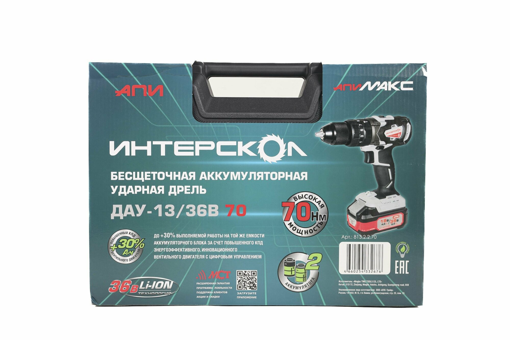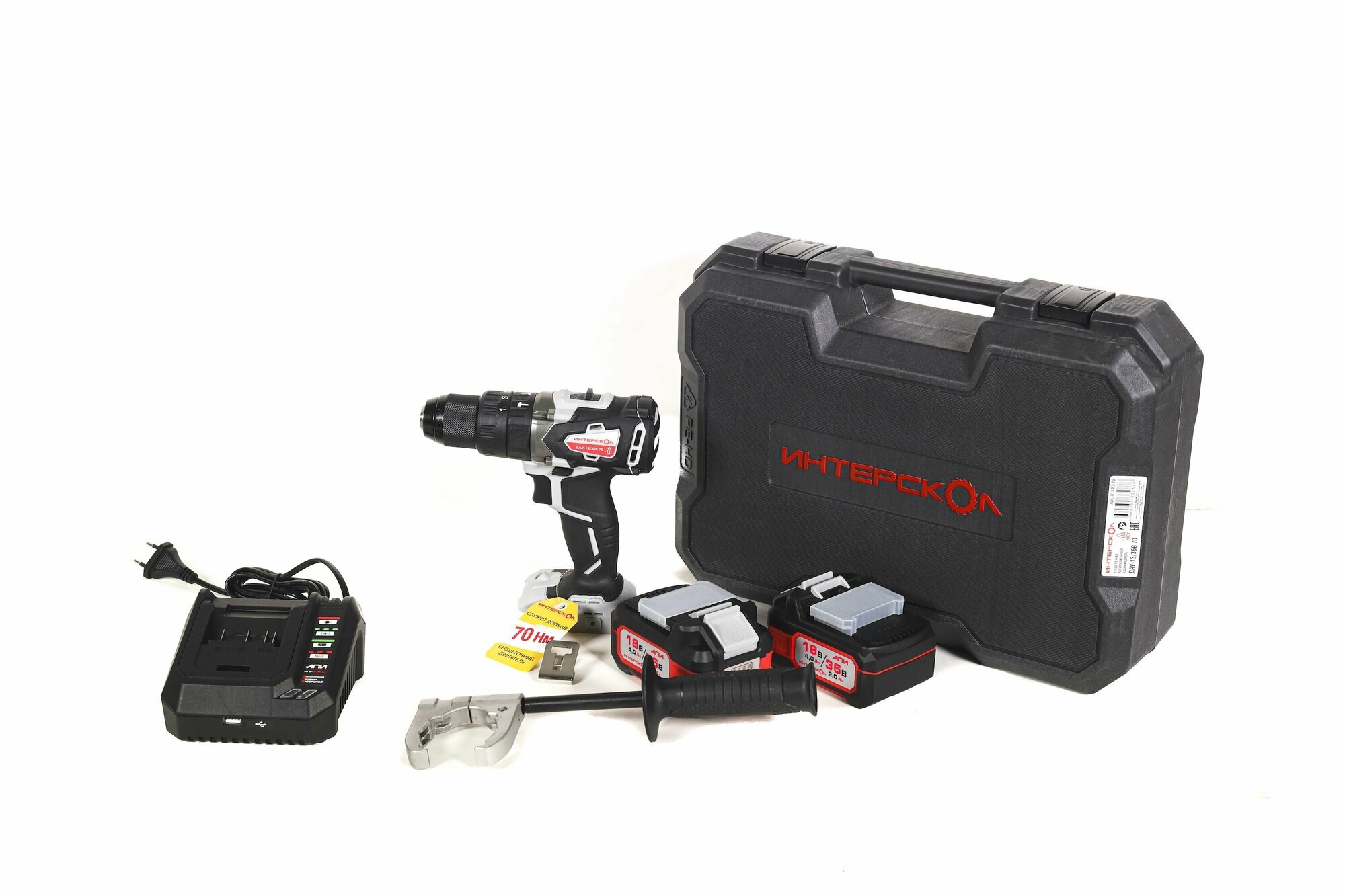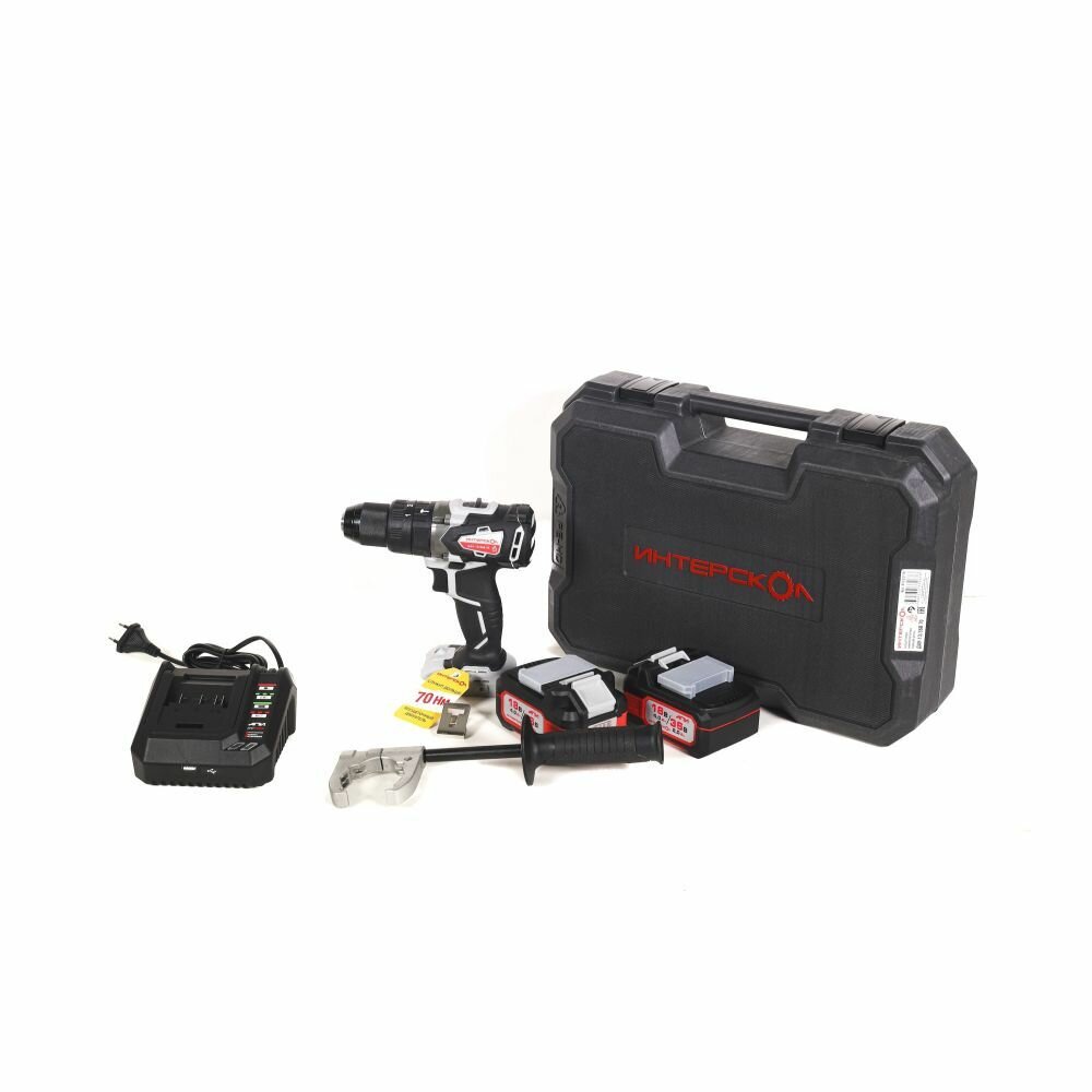 Бесщеточная аккумуляторная ударная дрель-шуруповерт ИНТЕРСКОЛ ДАУ-13/36В 70 36 В 70 Нм 1900 об/мин 30000 уд/мин с 2 АКБ 2 Ач и ЗУ в кейсе 813.2.2.70
