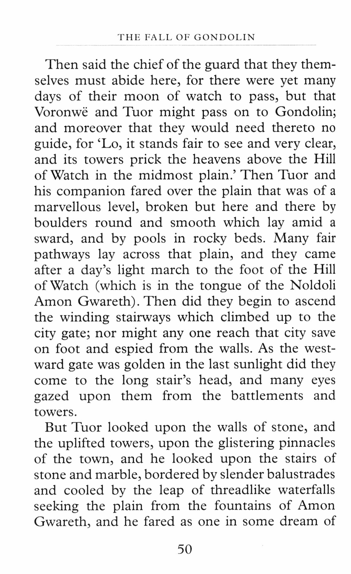 Central to this enmity of the gods is the city of Gondolin, beautiful but undiscoverable. It was built and peopled by Noldorin Elves who, when they dwelt in Valinor, the land of the gods, rebelled against their rule and fled to Middle-earth. Turgon King of Gondolin is hated and feared above all his enemies by Morgoth, who seeks in vain to discover the marvellously hidden city, while the gods in Valinor in heated debate largely refuse to intervene in support of Ulmo's desires and designs.