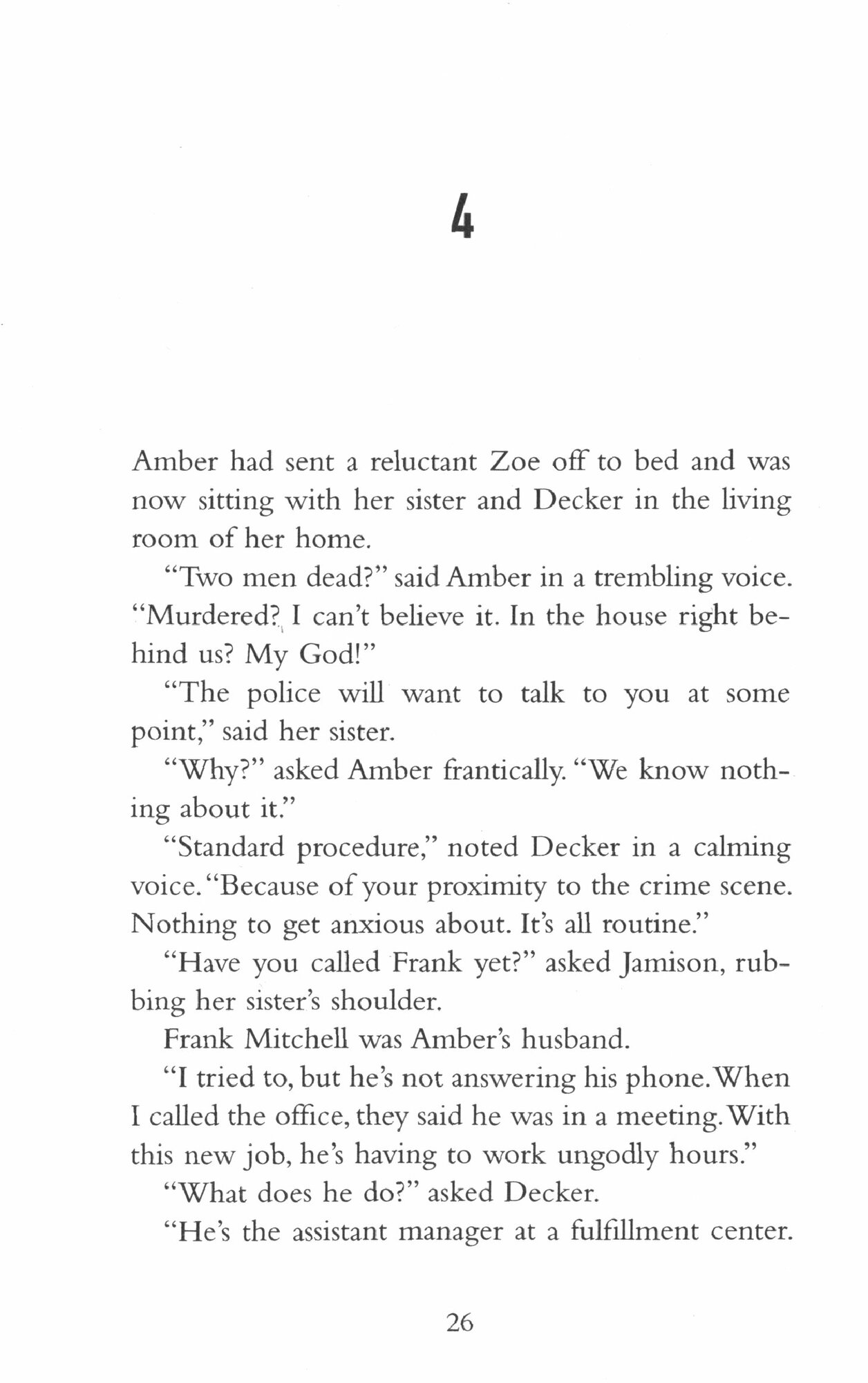 Small towns which have seen better times are not unusual. But the mysterious events in Baronville, Pennsylvania, are raising the highly-tuned antennae of agent Amos Decker and his FBI partner, Alex Jamison. What was supposed to be a relaxing vacation turns into a murder investigation when two bodies are found in a nearby deserted house.