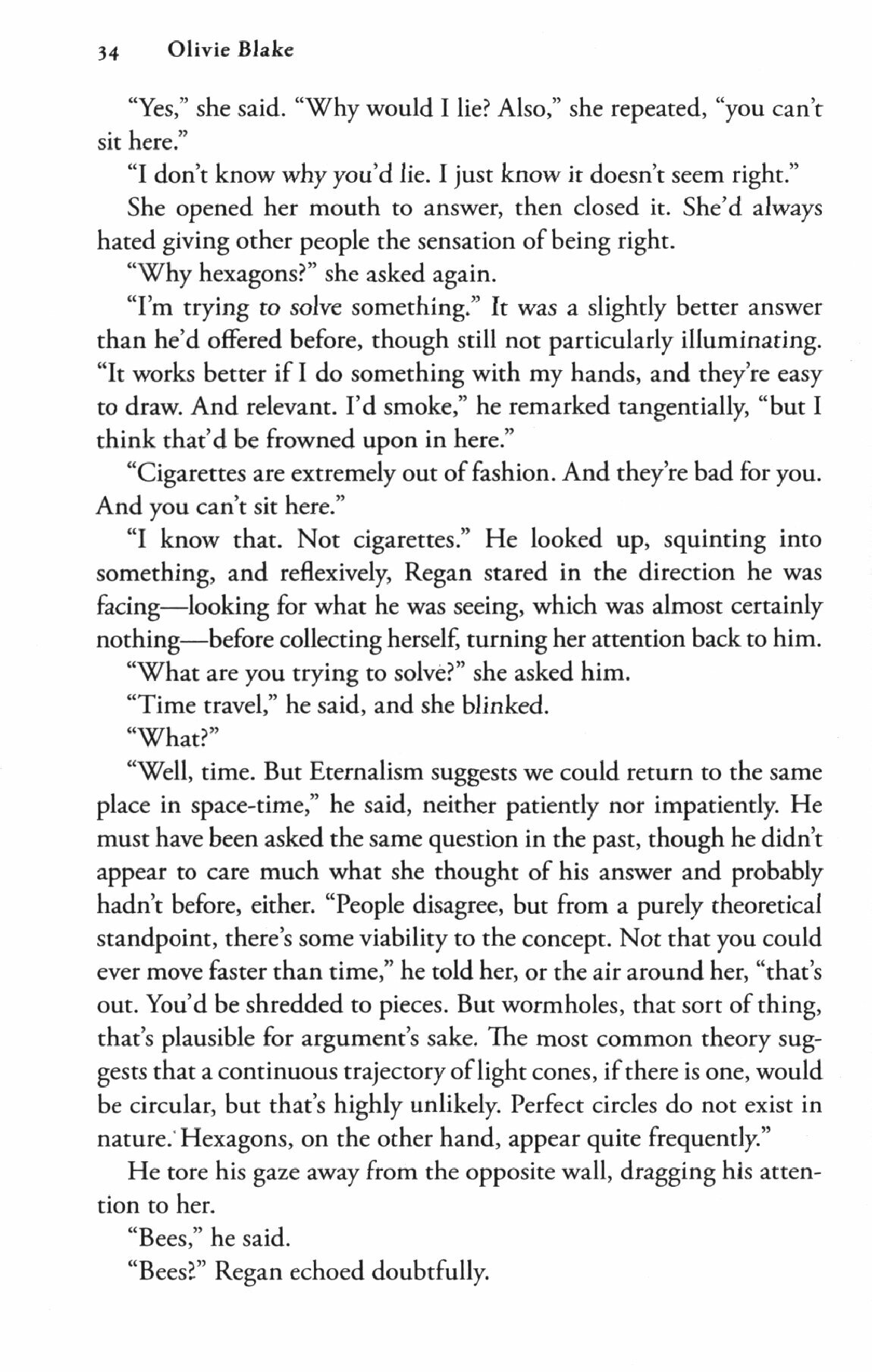 Chicago, sometime. Two people meet in the armory of the Art Institute by chance. Prior to their encounter, he is a doctoral student who manages his destructive thoughts with compulsive calculations about time travel; she is a bipolar counterfeit artist undergoing court-ordered psychotherapy. After their meeting, those things do not change.