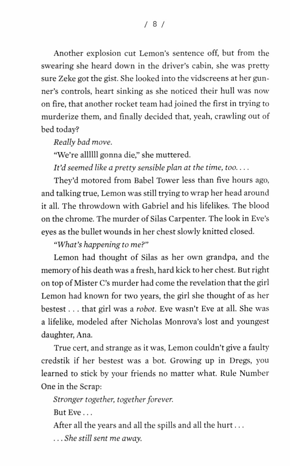 But with friends and enemies, heroes and villains, wearing interchangeable faces, nothing is as it seems. Soon, Eve and Lemon are racing against each other to find a missing girl whose DNA may hold the key to saving or destroying their broken world.