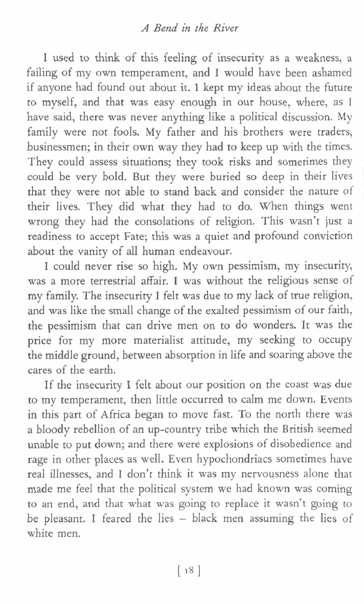 Set in an unnamed African country, V. S. Naipaul's A Bend in the River is narrated by Salim, a young man from an Indian family of traders long resident on the coast. He believes The world is what it is; men who are nothing, who allow themselves to become nothing, have no place in it. So he has taken the initiative; left the coast; acquired his own shop in a small, growing city in the continent’s remote interior and is selling sundries – little more than this and that, really – to the natives.