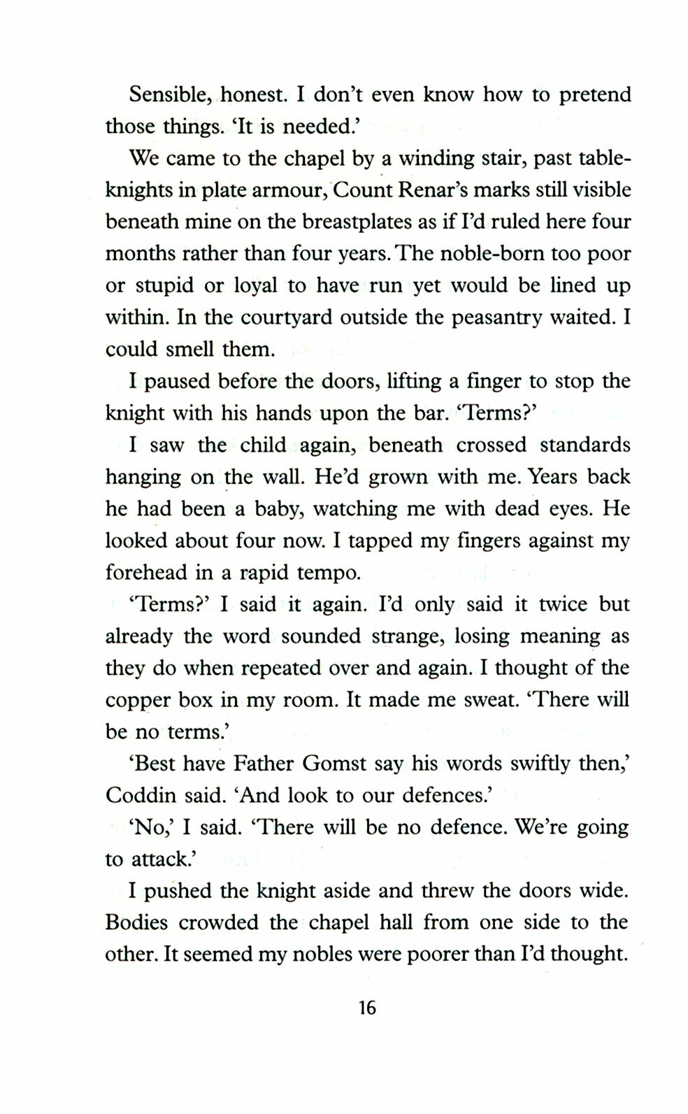 A six nation army, twenty thousand strong, marches toward Jorg's gates, led by a champion beloved of the people. Every decent man prays this shining hero will unite the empire and heal its wounds. Every omen says he will. Every good king knows to bend the knee in the face of overwhelming odds, if only to save their people and their lands. But King Jorg is not a good king.
